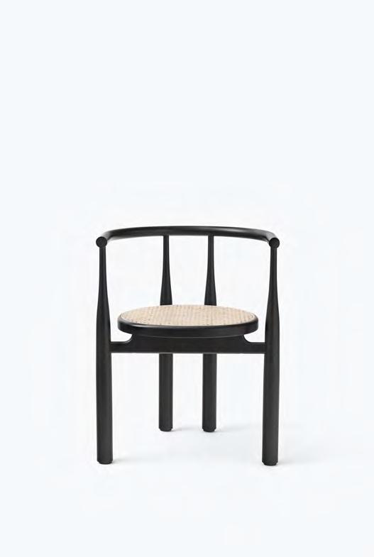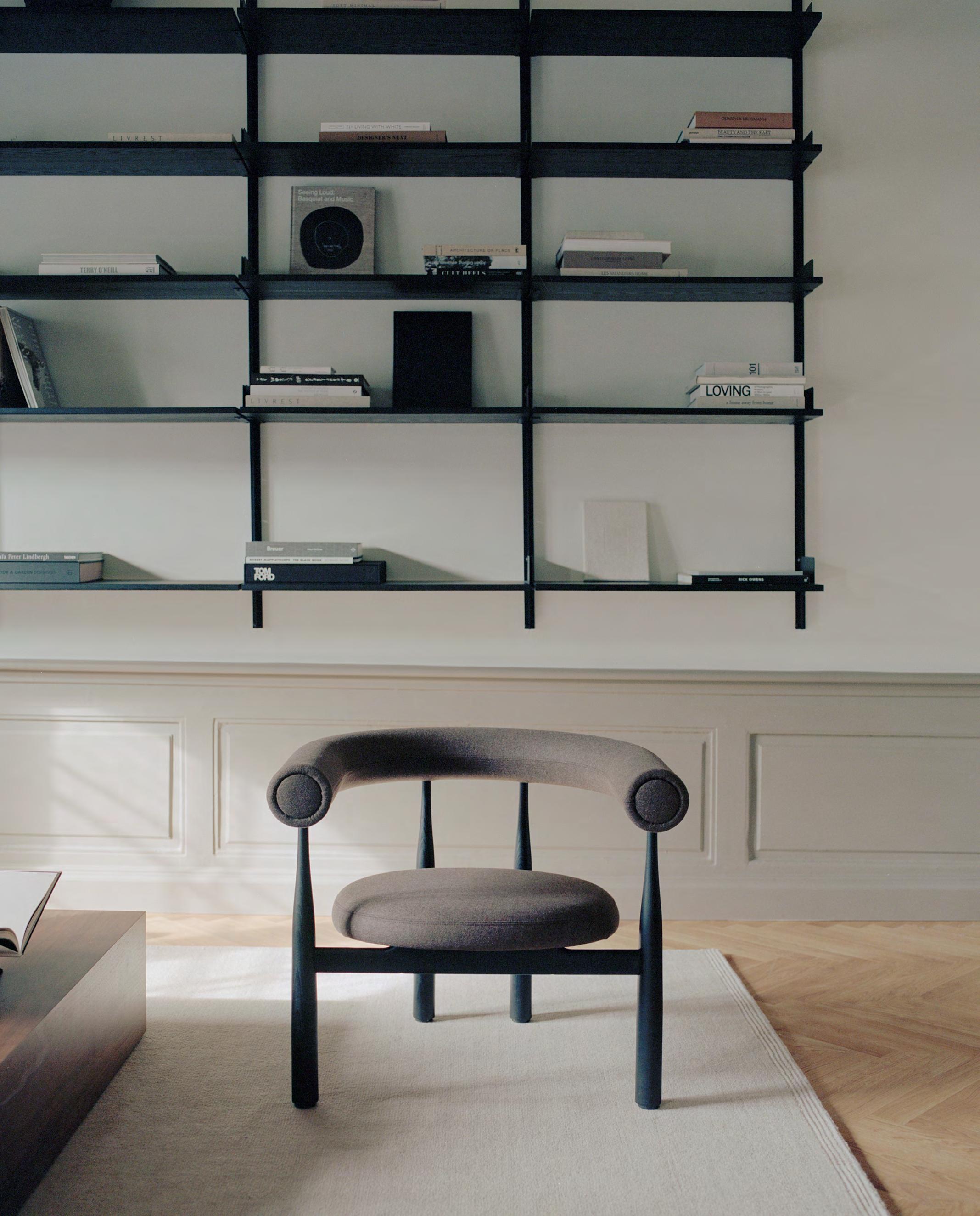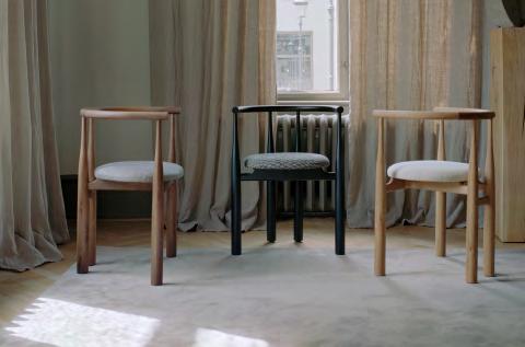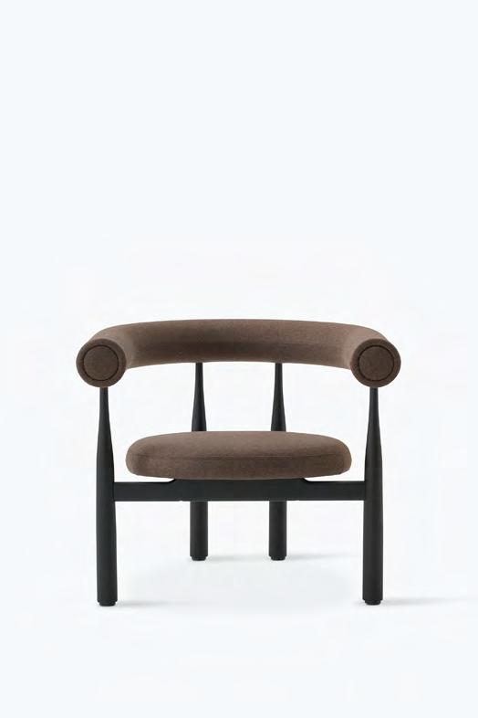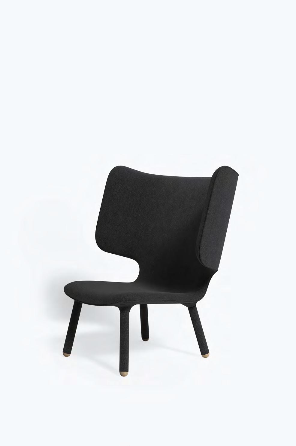 Black painted beech, upholstery, shown with Nevotex, Wooly Plus, 1008