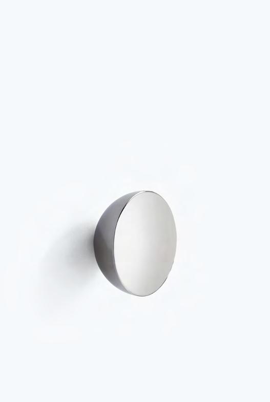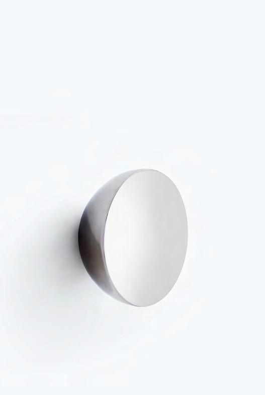 The bold materiality of the Aura Mirror is what generates its unique inner glow. Its polished metal form picks up surrounding light, creating diverse reflections through a combination of hard flat surfaces and long curves.