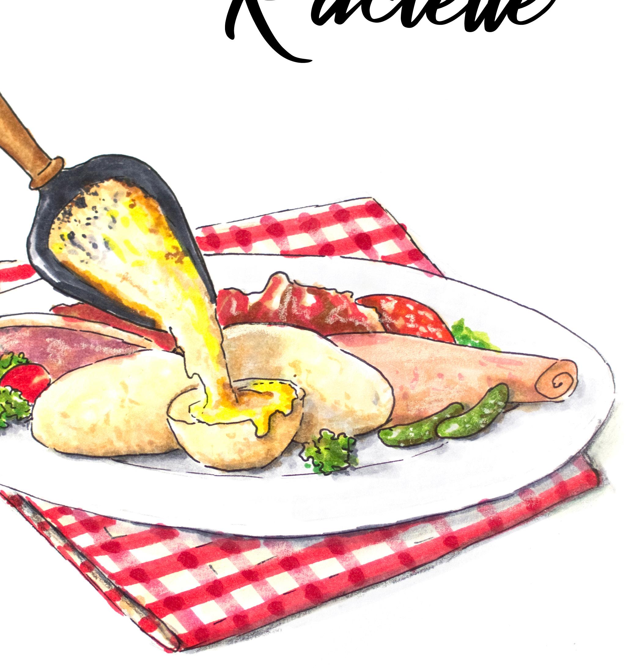 A traditional French/Swiss dish that involves melting cheese and scraping it onto other foods, or the special grill used to prepare the dish. The melted cheese is typically poured over boiled potatoes and served with accompaniments like charcuterie, cornichons, and onions.