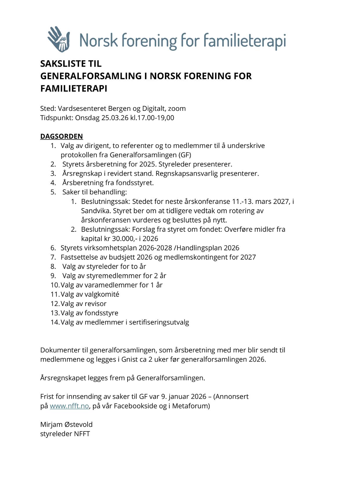 NFFT er en forening jeg er stolt av å få være en del av! Engasjementet er så tydelig i alt som gjøres rundt om i landet, og det skjer mye godt arbeid for å spre kunnskap om familieterapi i lokallag i hele landet Jeg blir oppriktig inspirert av hvordan mange av dere legger ned tid, erfaring og entusiasme for å løfte et fag vi vet gjør en forskjell for de vi møter i vårt arbeid Tusen takk også til dere som har gått foran i denne foreningen, jeg kjenner meg stolt av arven vi bærer med oss.