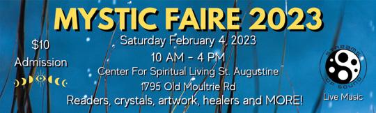 The Center for Spiritual Living, in St. Augustine, is hosting their triannual Mystic Faire on February 4, from 10 a.m. until 4:30 p.m. There will be local and regional psychics, mediums, astrologists, numerologists and tarot card readers. Holistic healers, including shamans and reiki healers, will be offering sessions.