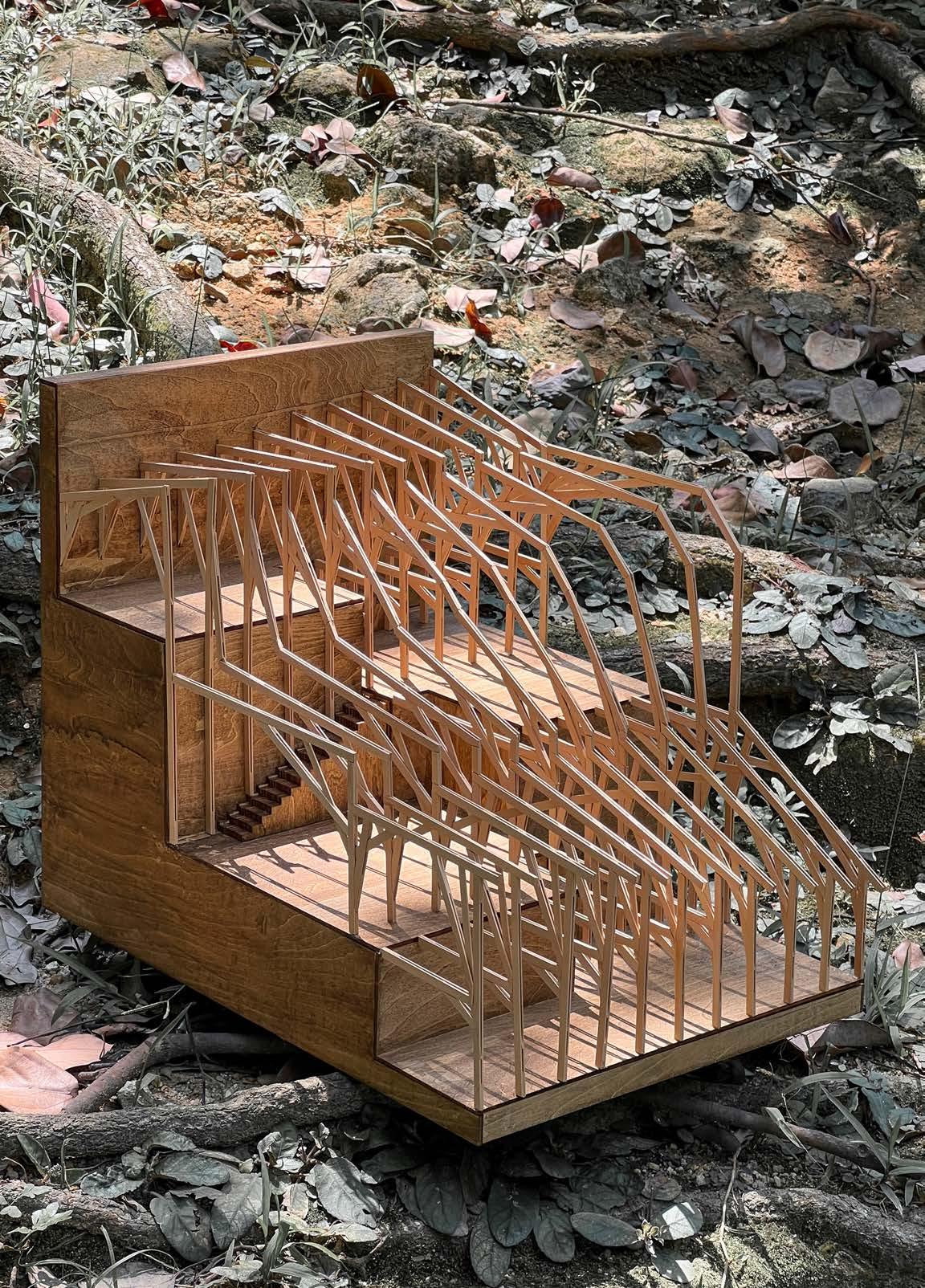 Structurally speaking, composed of 11 frames with a gradual change in the angle of the beams, the timber structure is assembled using an A|B|A method, where the B plane acts as joints and is sandwiched between two A frames, connected by bolts. All the frames are then connected in series to reduce buckling, and a triangulated roof is deployed to showcase the gradual change in degree.
