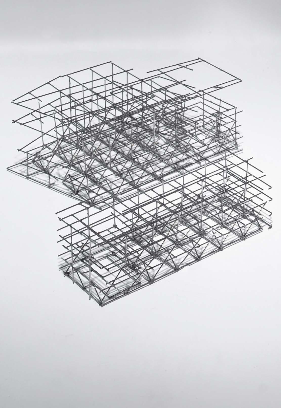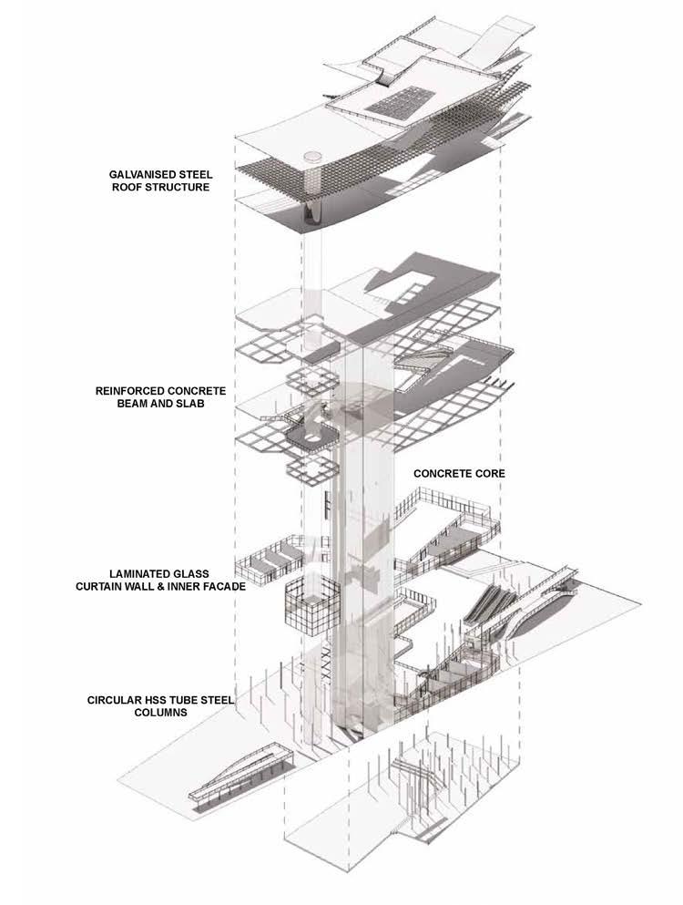 Structurally, the building is divided into two solid masses, creating two open spaces between them. The two solid masses are attached to the core support, enclosed and utilizing slanted trusses in two directions on the first floor, followed by slanted trusses in one direction on the second floor, and finally, only straight columns on the third and fourth floors to maintain structural integrity. The entire structure is connected through metal beams to provide additional support.