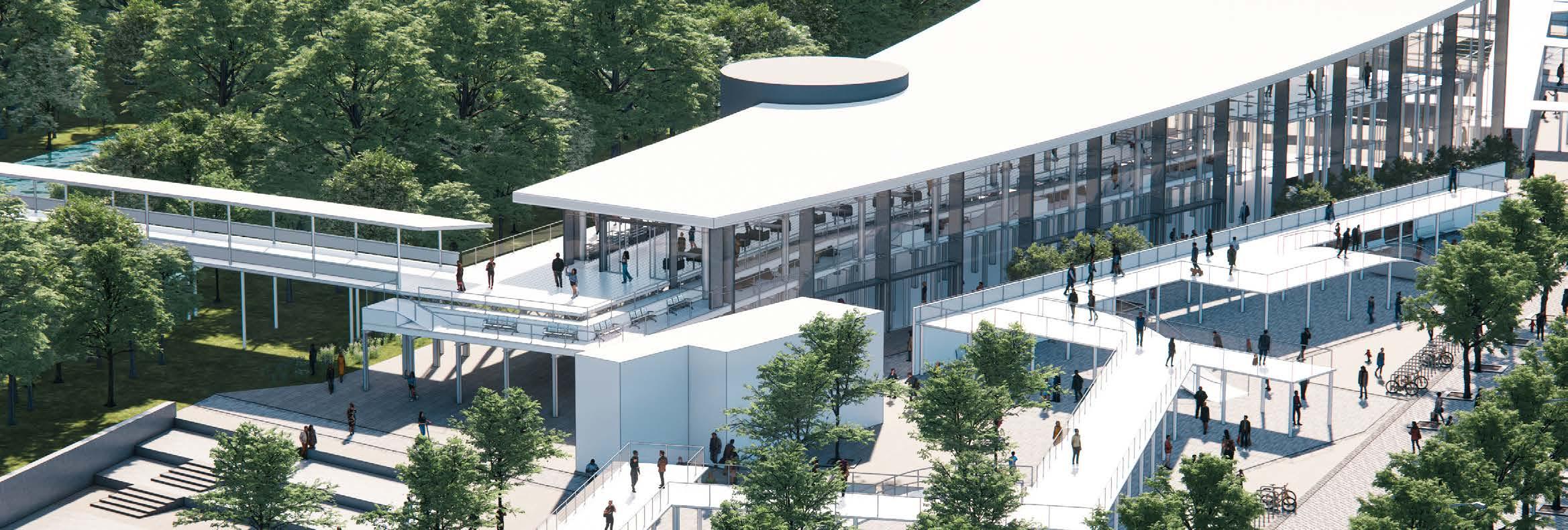 public remiges, their slanted roofs integrating with the station to form a cohesive public ground plane. This approach harmonizes with existing infrastructure while creating new spatial experiences.