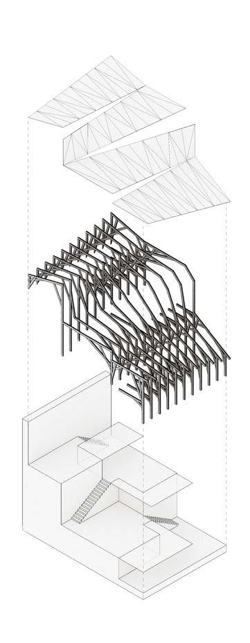 The concept started with a thermally derived grid generated through solar chimney placement, which is optimised to maximise sunlight exposure and the thermosiphon effect. This creates an unconventional grid that responds directly to the performance of solar chimneys rather than arbitrary geometries. The resultant differentiated steel frame articulates environmental logic through scale variations, with large central structures creating highceiling public areas as thermal drivers, while secondary structural elements with reduced dimensions accommodate private functions that use conventional HVAC systems.