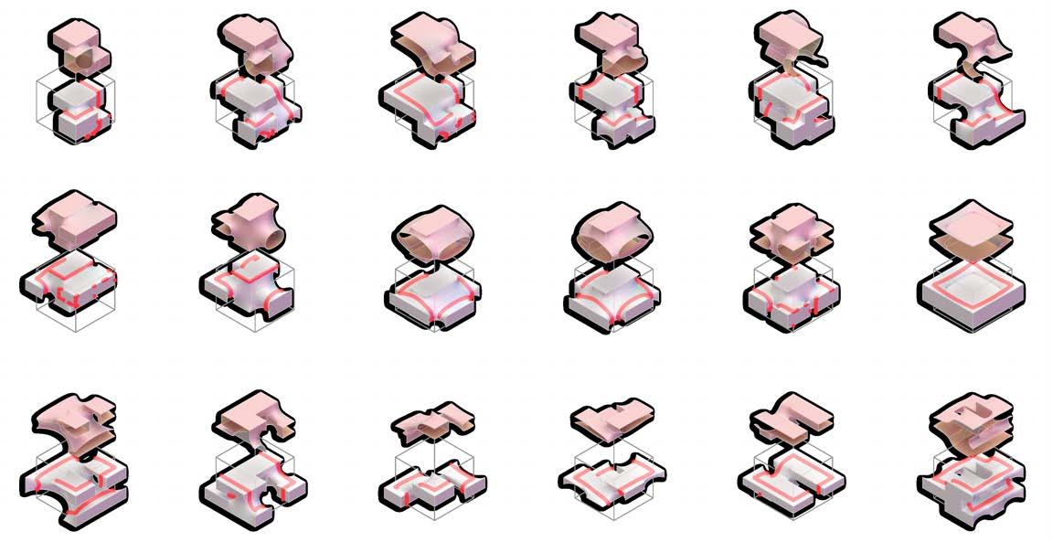 An intrinsic attribute of minimal surfaces is their ability to create seamless bridges between volumes, which feed back into themselves, the resulting minimal surface forms a loop, reminiscent of a torus but with varying levels. It defines the interior and exterior of the loop, playing with the grid to create spatially intriguing inside-outside moments.