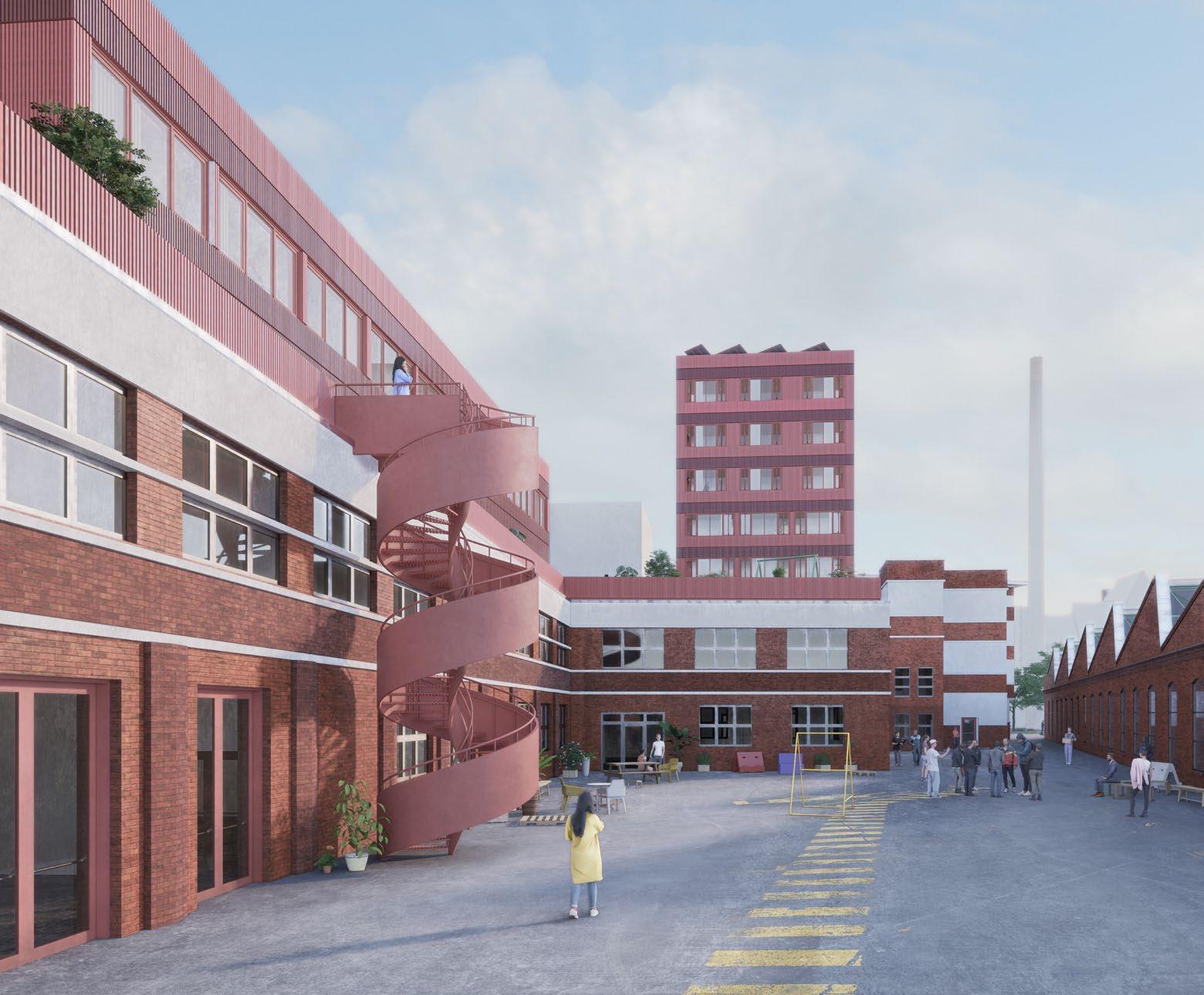 Da die Halle im Zentrum des Geländes liegt und das Herz des Viertels sein soll, muss sie größer sein, mehr Licht und eine größere Flexibilität haben. Da sie nun fast doppelt so hoch ist, kann sie den kulturellkünstlerischen Bedürfnissen des Viertels und der Stadt gerecht werden. Sie kann nun das kulturelle Ziel Berlins sein, in dem große und kleine Veranstaltungen stattfinden und Kunst in größerem Maßstab präsentiert wird.