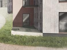 The wall structure encloses the Lakeamäki area as a unified whole and serves as a noise barrier. It is dual-sided—public spaces like stairwells and common areas face the noise source, while apartments open onto courtyards.