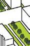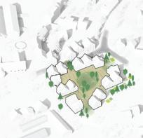 Urban village blocks blend elements of city and rural village atmospheres. Relatively tall buildings clearly define the street space while framing the courtyards, which contrast with lush, partially natural greenery.