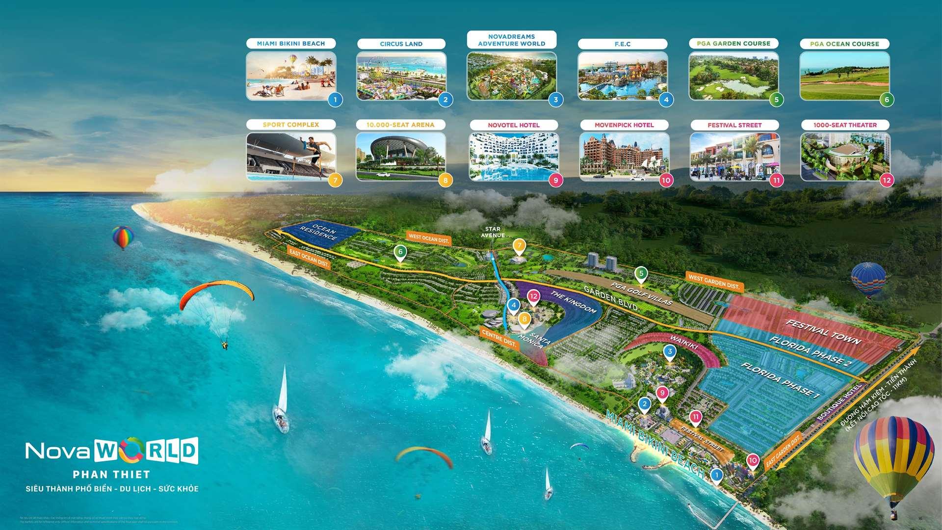 Bikini Beach, Ocean Kingdom, PGA Golf 189ha, F.E.C, M.I.C.E, sân vận động 50.000 chỗ, sân khấu trong nhà 10.000 chỗ, CLB Thể thao biển, Quảng trường, Sân khu ngoài trời colosseum, Công viên, bar, khu mua sắm ven bãi biển …