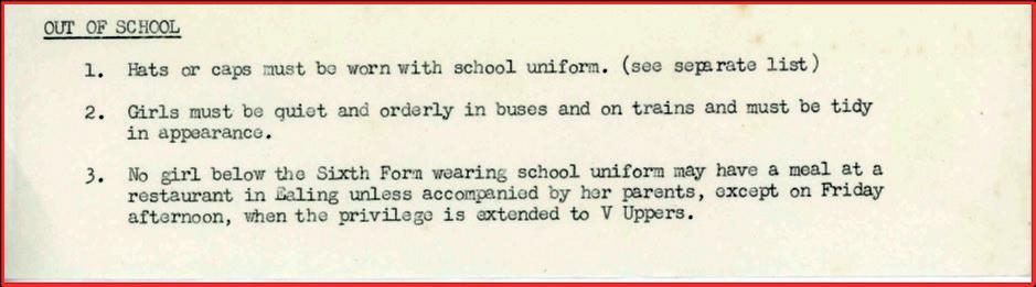 All lessons were 40 minutes, although we had double lessons for Science and Art. School ended at 4.10pm. On very foggy days we were sent home early, but I needed a note stamped by Miss Hendry that let me use the buses earlier. There were Acting, Poetry Reading and Debating Competitions. I recall many hours of practice for the Annual Prize Giving, which was held in Ealing Town Hall, I think. One year we all learnt the French National Anthem in honour of the (French) guest.