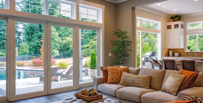 A blend of indoor and outdoor living areas continues to trend. A large patio door leading to an outdoor space brings light and easy access to a patio highlighted by an outdoor kitchen and lounge areas. The newest outdoor lighting is efficient with bright, adjustable LED lights which can shine on important areas of your property for both beauty and safety.