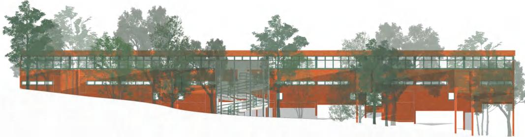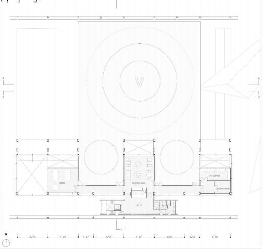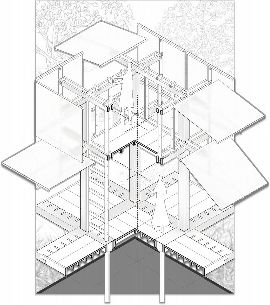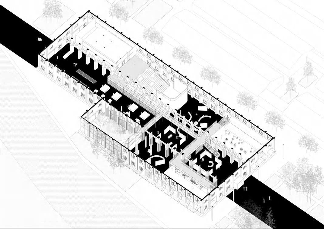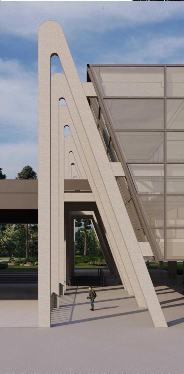 Positioned over a concrete parking lot, the vetiport enhances the festive race atmosphere by connecting to theparking area, elevating to the frst floor to form a welcoming gathering space. Aditionay,its design incorporates a floating aspect that defnes thespace below, improves connectivity, and potentially serves as a viewing stand during races, maximizing space utility.