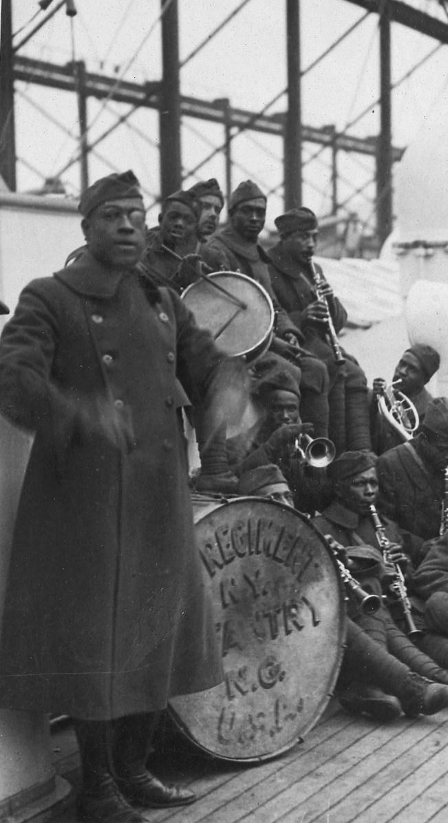 African American Jazz Band and Leader Back with the African American 15 th New York National Guard (later known as the 369th Infantry Regiment or “Harlem Hellfighters ”. This was the first regiment formed in New York to fight in World War I. Image by Underwood & Underwood (12 February 1919). Public Domain made available through the US National Archives and Records Administration