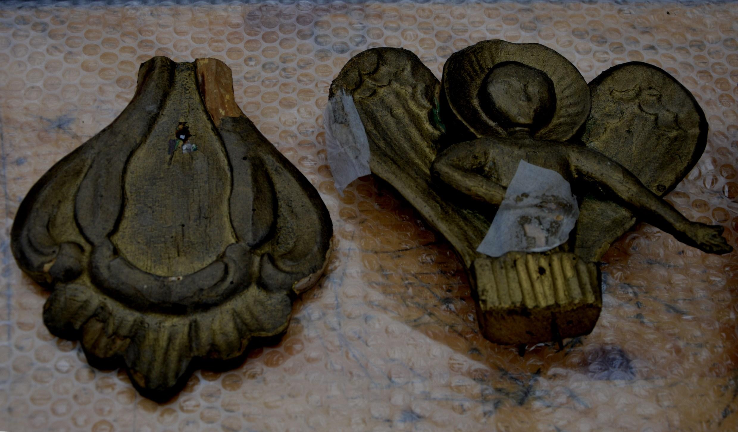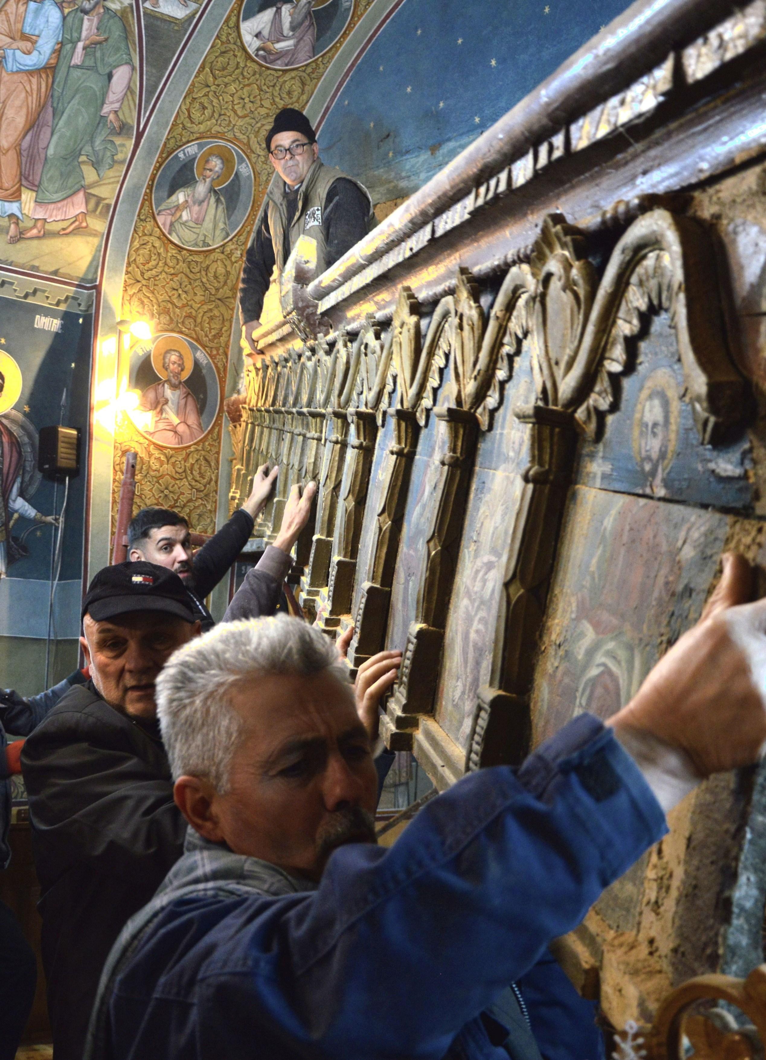 Front and back covers: The third stage of the iconostasis removal: dismantling the Apostles' Tier, located beneath the Crucifixion cross. (Story on p. 20)