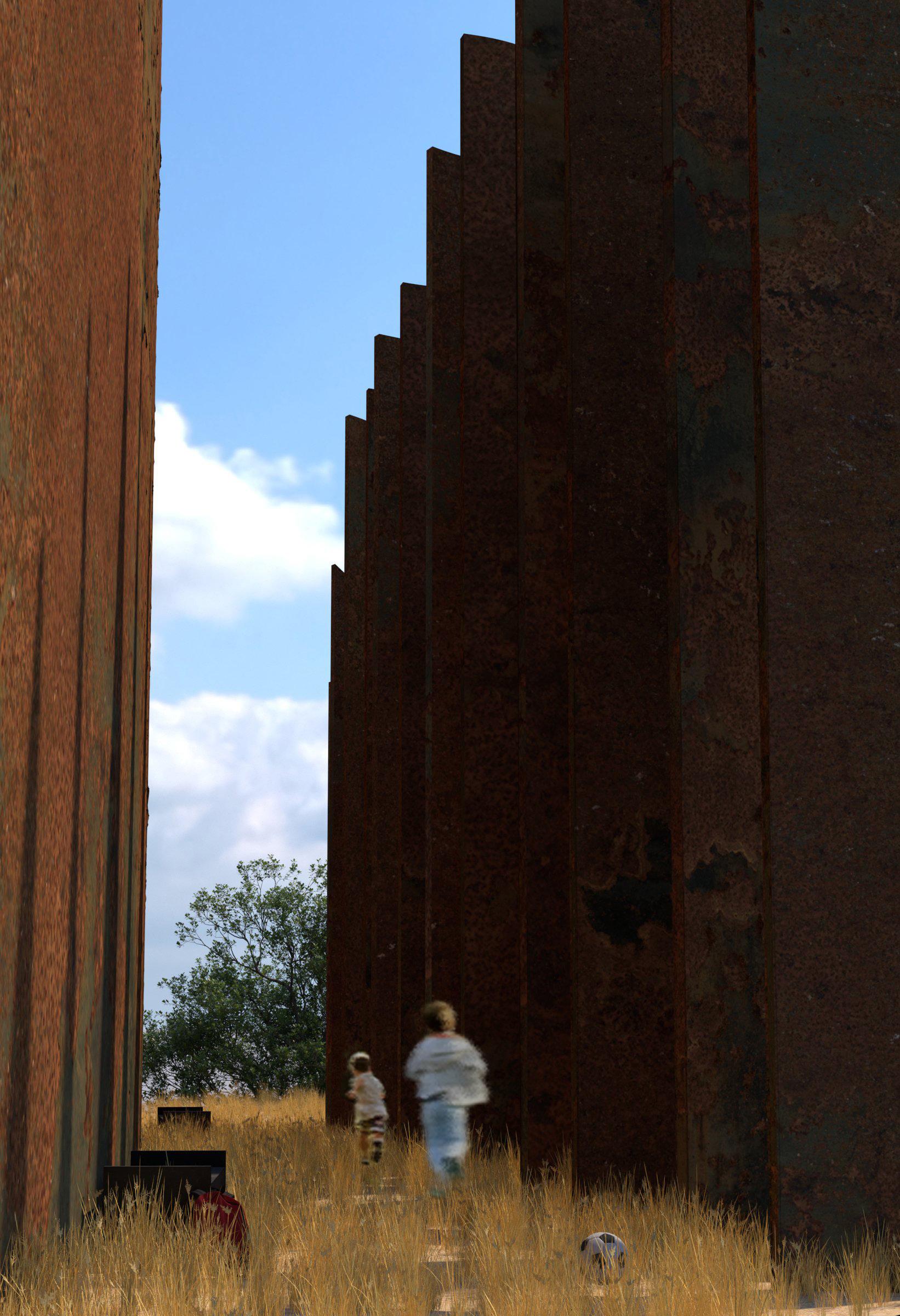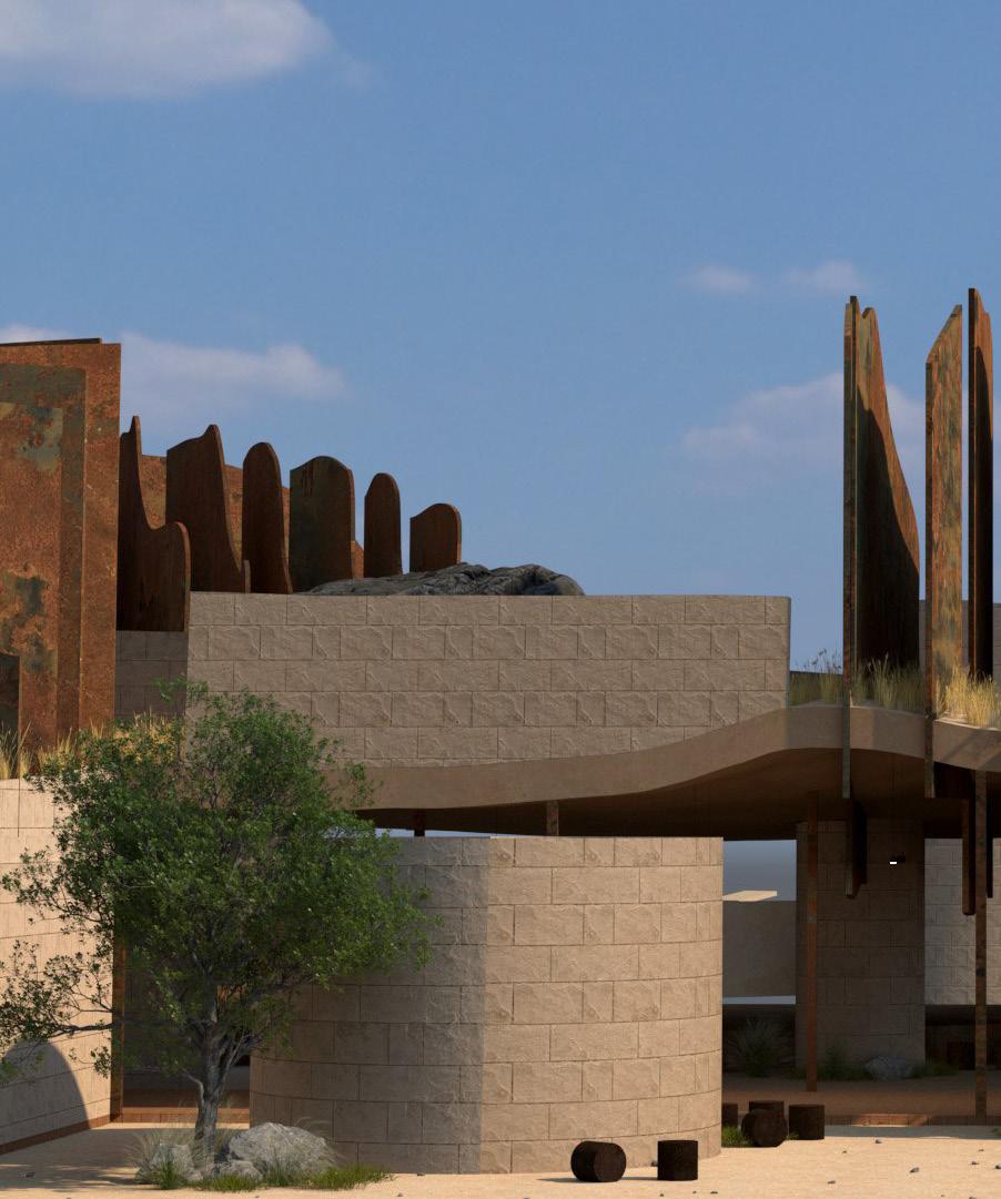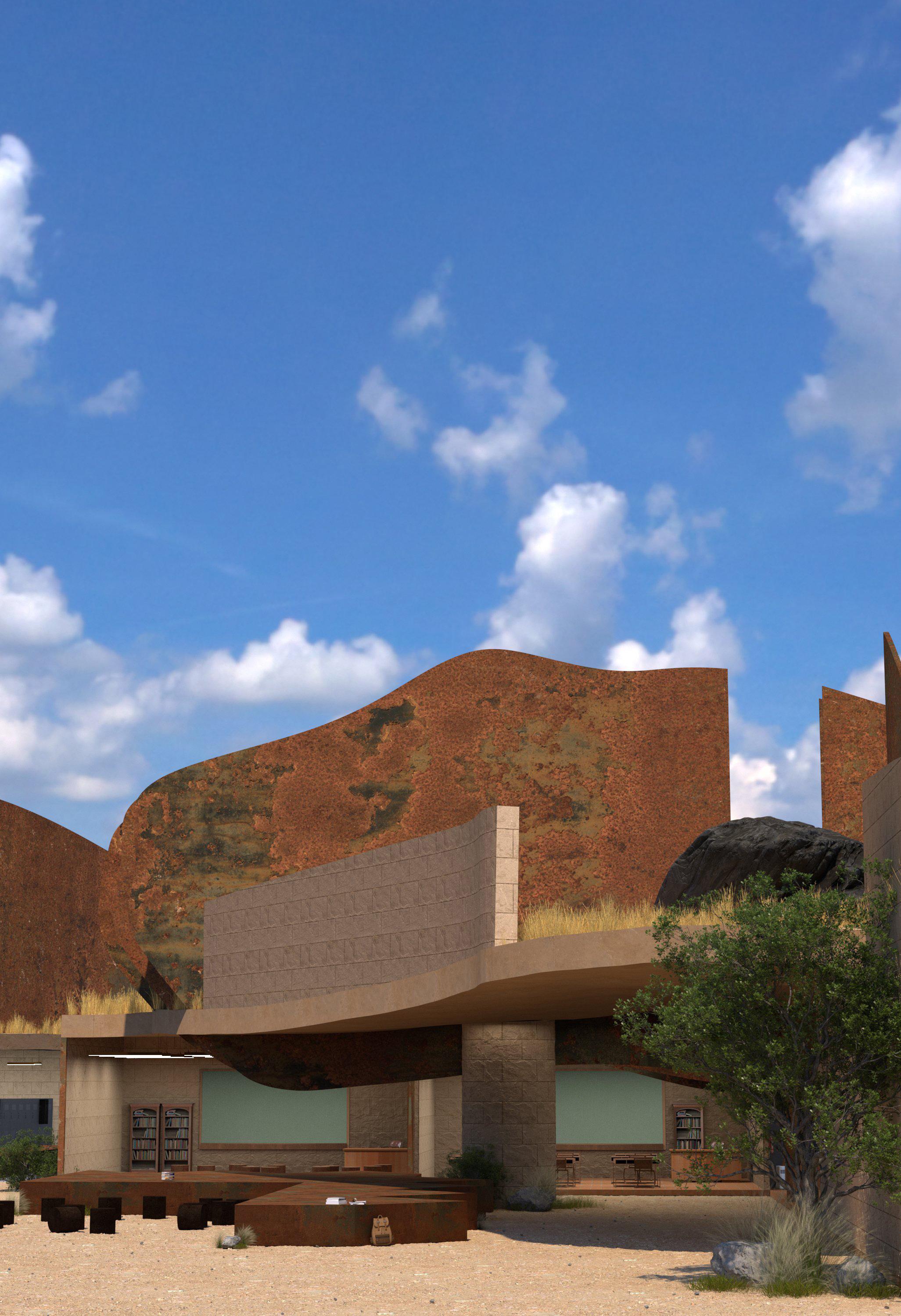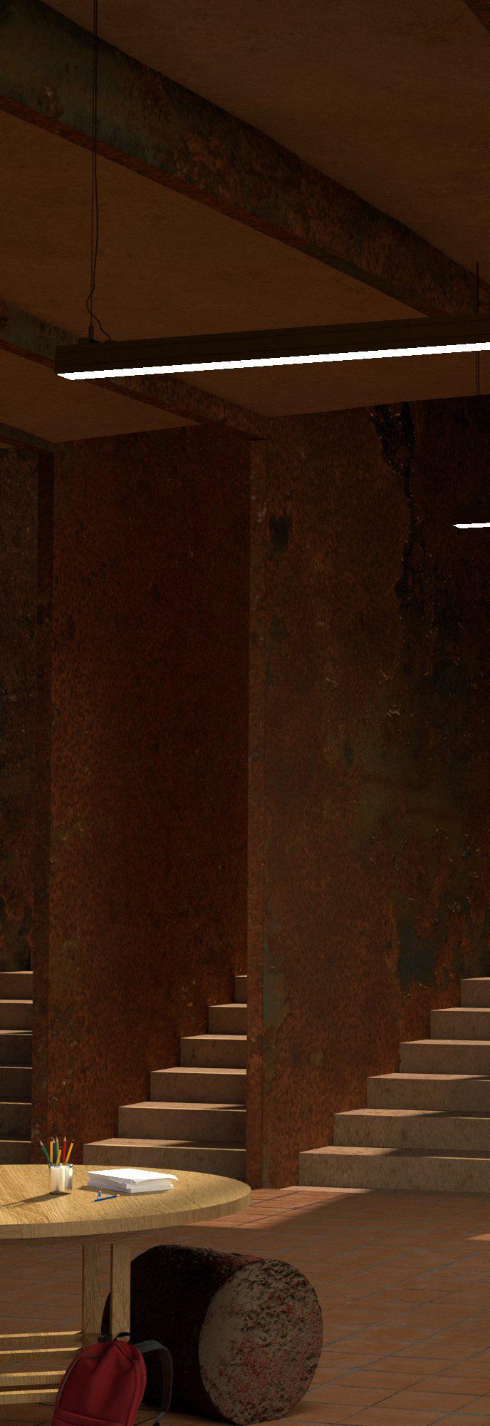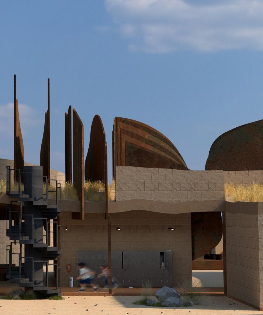 ALMOST is a study of spatial intimacy, exploring vast and extremely tight sensations of space through contrasting program and form. The large rusted blades seemingly pierce the school, becoming both individual objects and one, through proximity to not only one another but also the relation of the viewer to the form. Behaving as a rooftop learning space, the blades separate spaces and begin to function not only as walls but as objects that cut, hide, and bend space. Certain moments the blades span 8’ apart from one another yet bend to form a 3’ bottleneck, almost too close to walk through. Contrasting the completely open floor plan of the classrooms and learning spaces below. The primarry School, located in Boyle Heights Los Angeles, is designed to encourage space to be treated not as non-existent but rather an invisible solid that is defined and shaped by walls, roofs and ceilings.