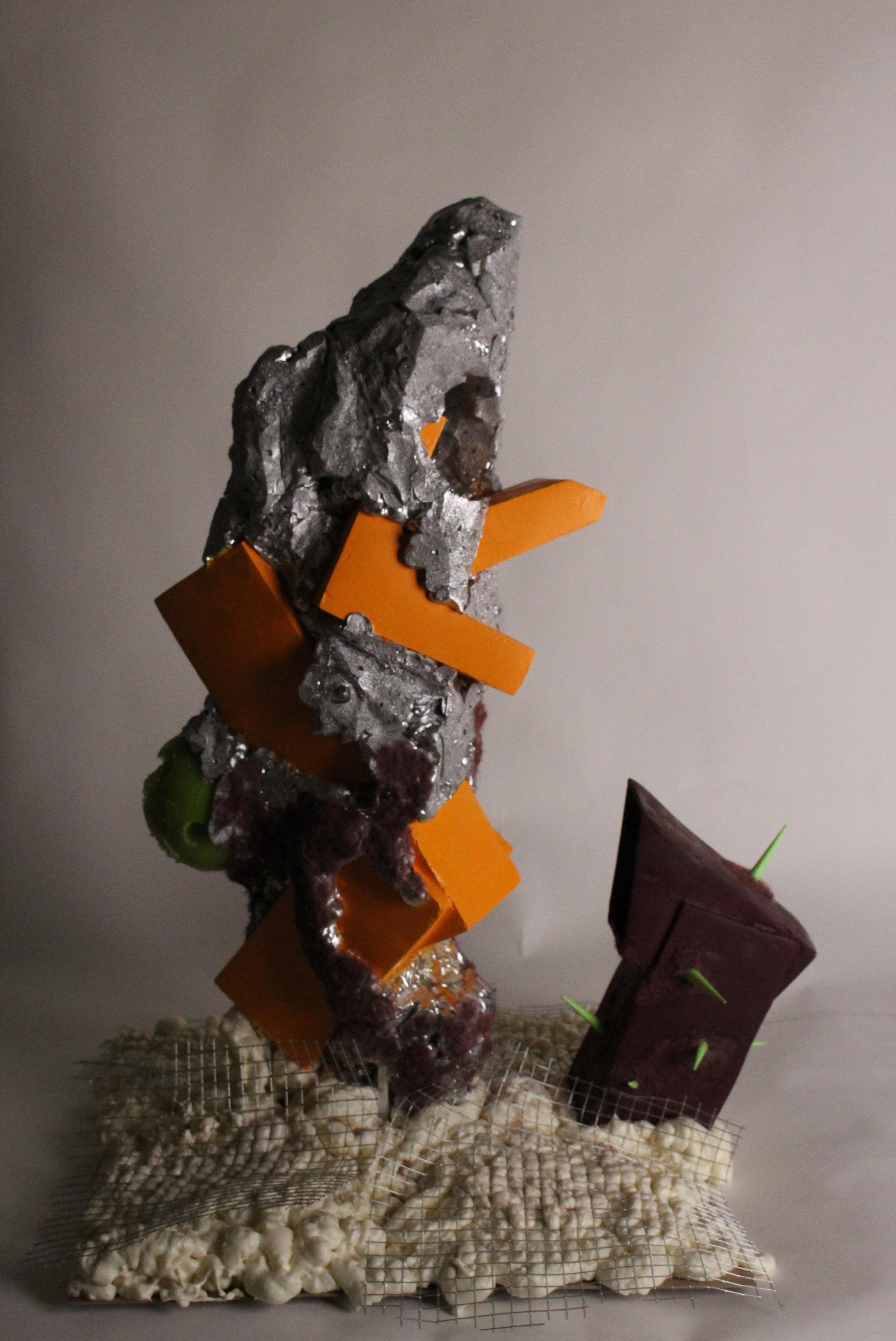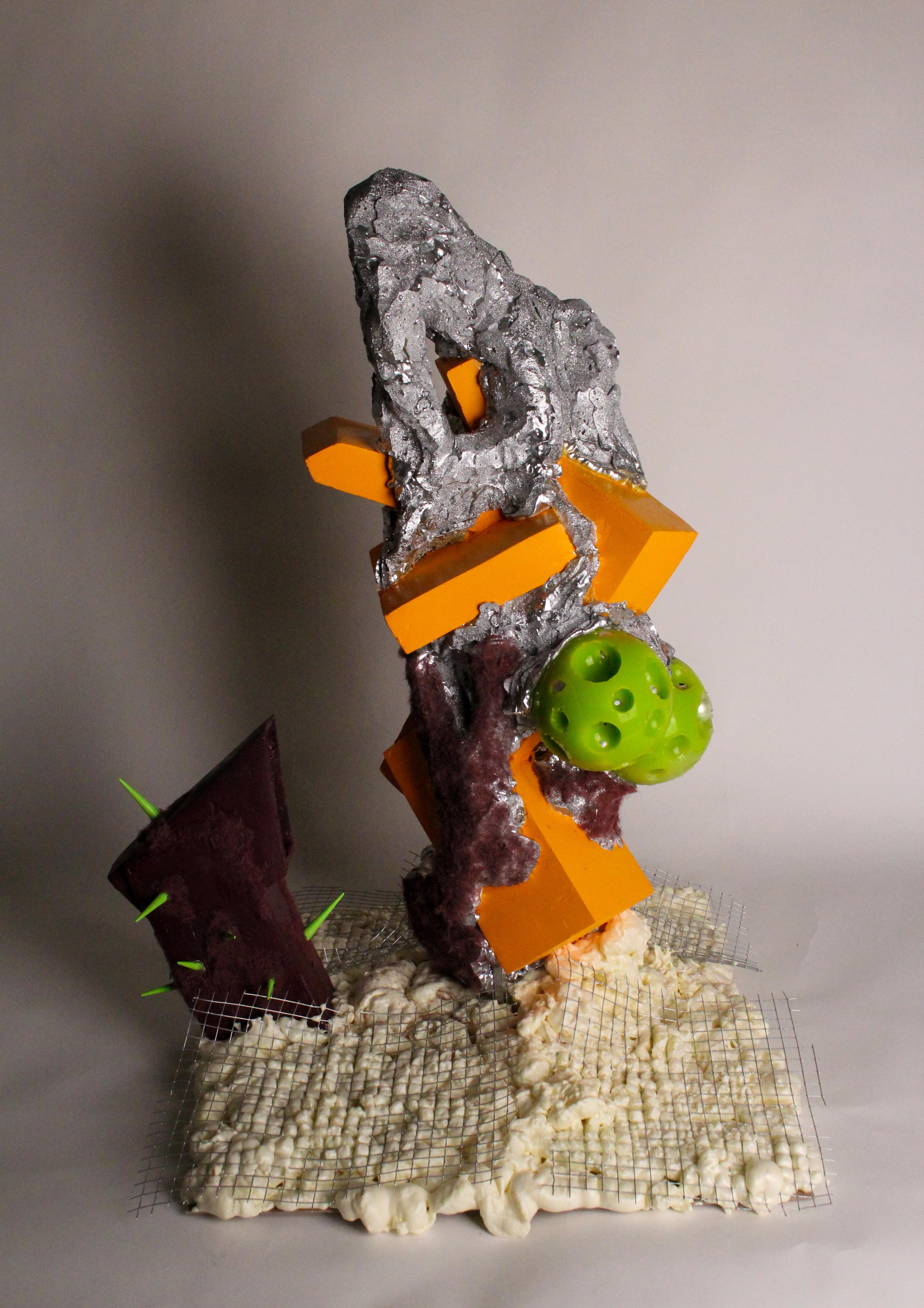 ACID BOOM is a sharp, fuzzy, loud, and slightly obnoxious language. That uses material and form to express these characteristics. I explored forms that I encounter in day to day life, and studied them to create a unique language. This furthers the ever-growing conversation between form and its relationships to space. ACID BOOM is focused on the study of these objects and furthering our relationship to space influenced by the plasticity of objects. Through the use of materials used to construct the “world” we rediscover the negative space as volume through form.