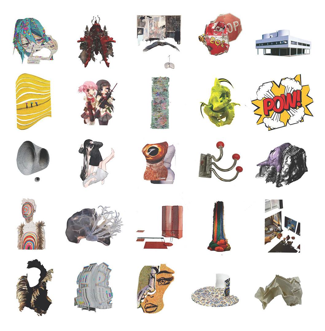 Studying and combining artworks and architecture from Corbusier, Robert Rauchenberg with anime core style imagery. Studying formal and material relations across mediums and styles.