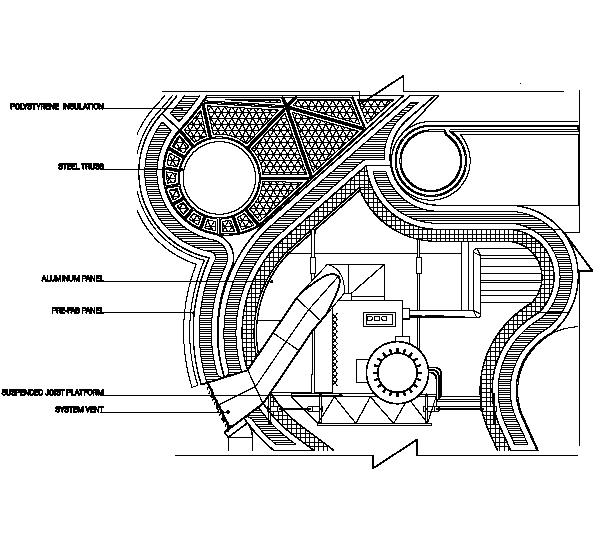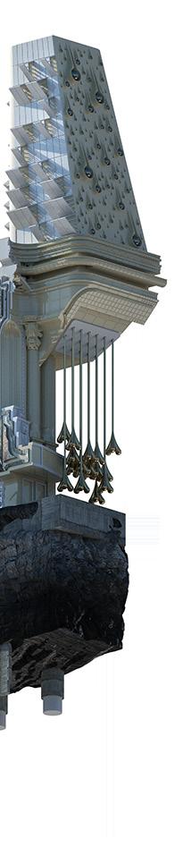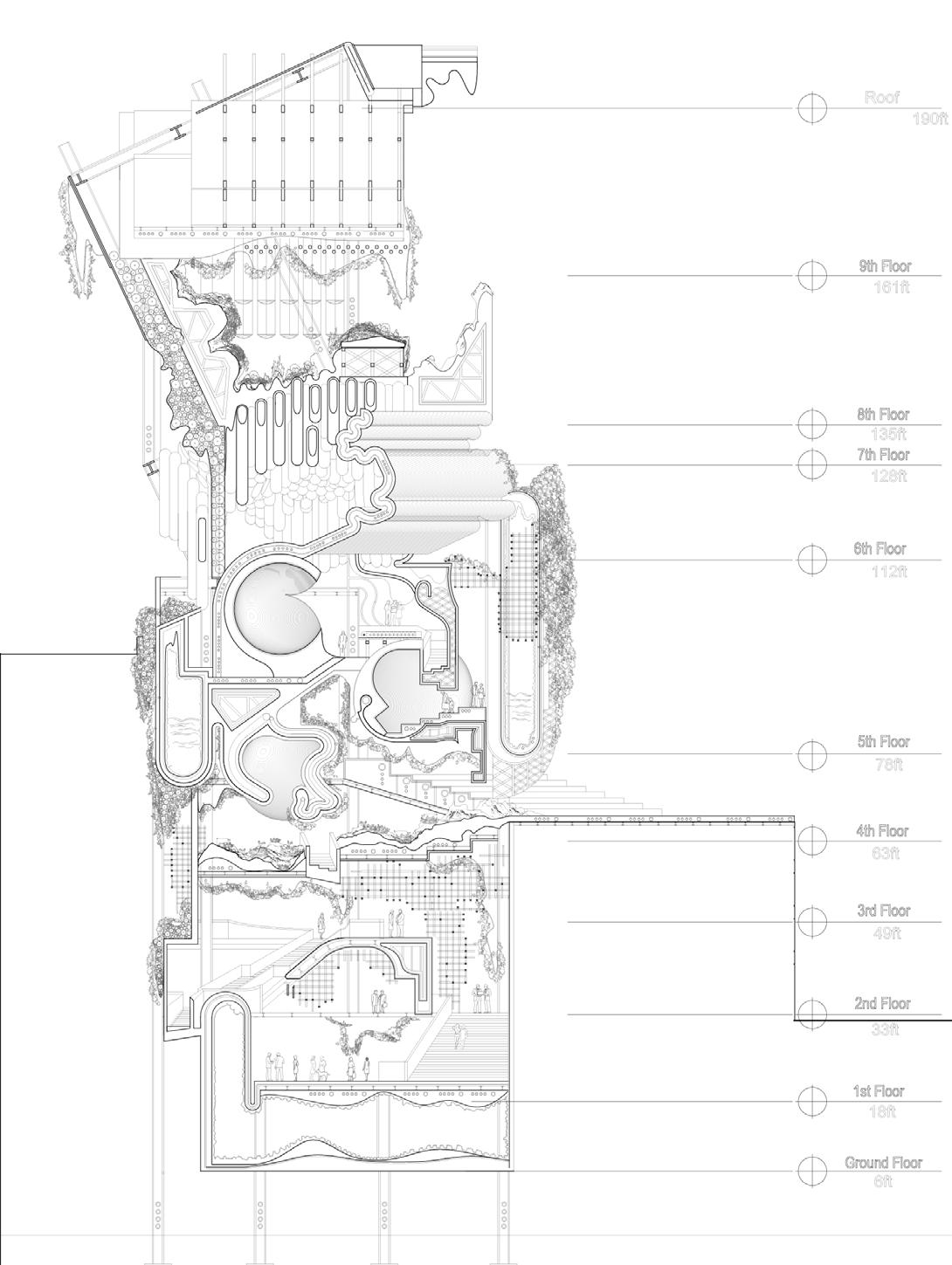 Agiant solar roof hovers on top of Sky-House, creating a shaded microclimate beneath. This style of roof is coined as an Earth Protector, referring to its kindness to the earth and to the inhabitants below. The solar array contains 50 commercial grade solar PVs, normally used for solar fields outside the city, tilted up to create a sawtooth profile in the building’s elevation. This array produces 3.6 MWh/year of power, making it 360% energy positive, enough to power four homes of this size. The house therefore does not draw power from the city, but rather feeds power into it, revealing a new model for sustainability based on excess rather than lack. The Underside of the roof becomes a surface for video art projection, visible far away from Sunset Boulevard. A vortex stair spirals down from the roof, replacing the circulation of the historic house, connecting all levels with deep diagonal views across the space and out to the city through glass. A new office-- the owner’s “control bridge”-is tucked between the roof and the existing balconies, featuring commanding, 300 degree views of the city.