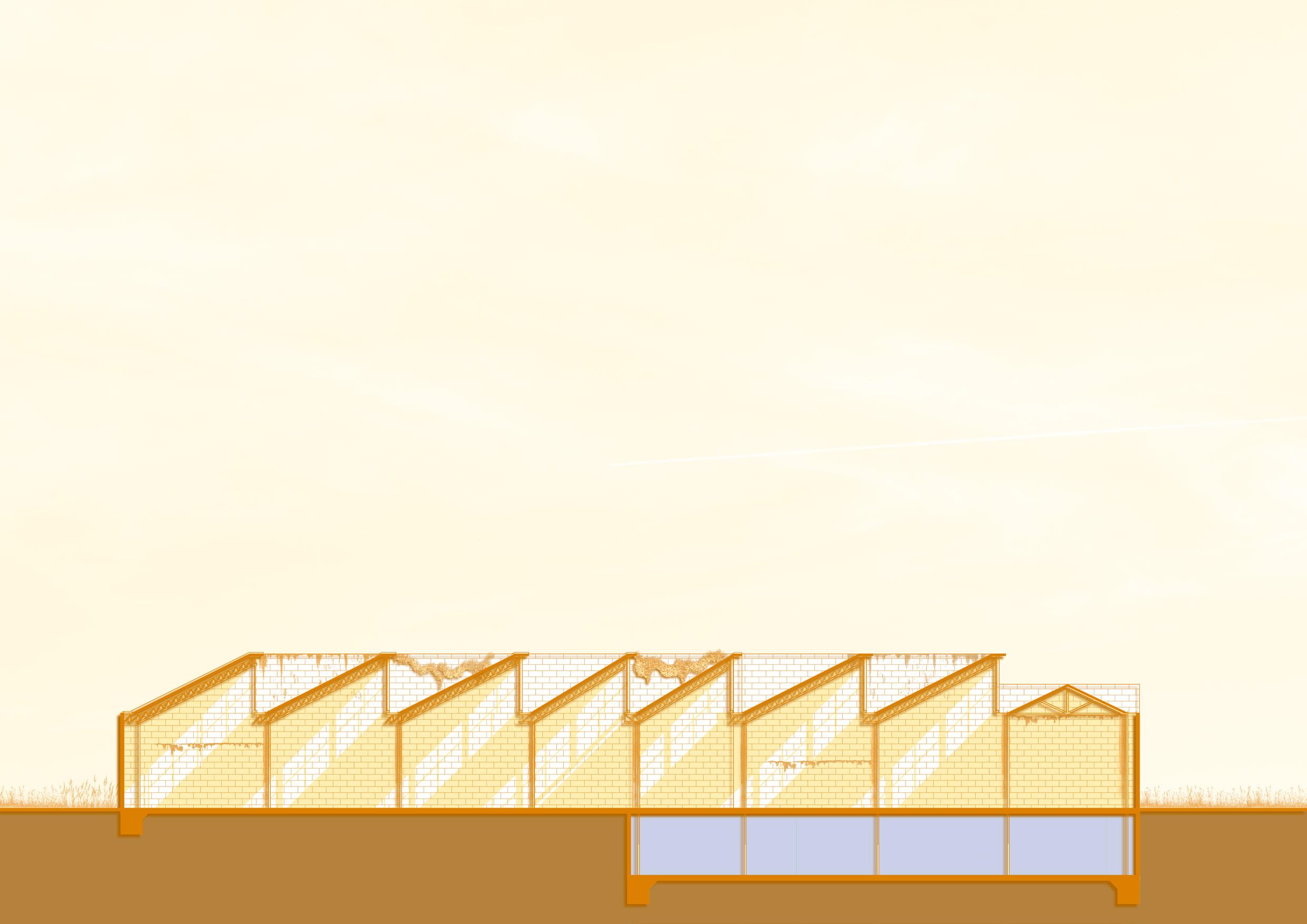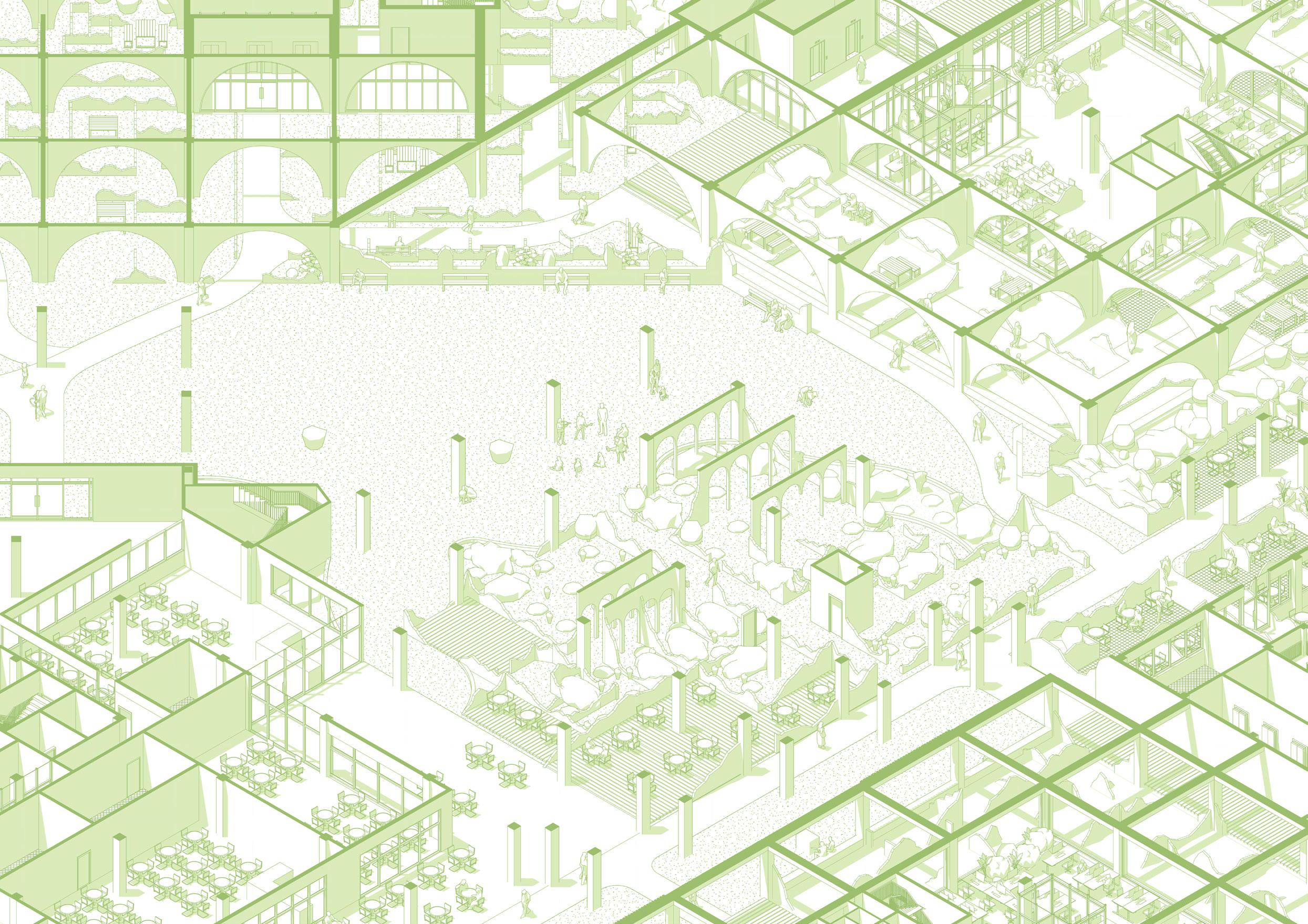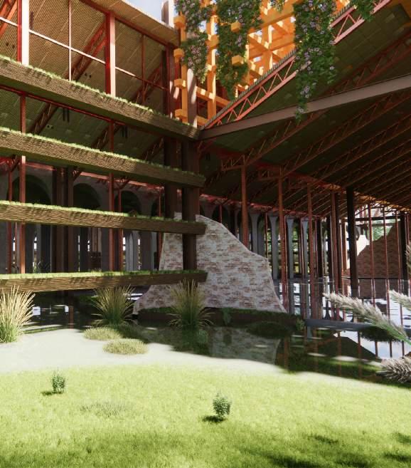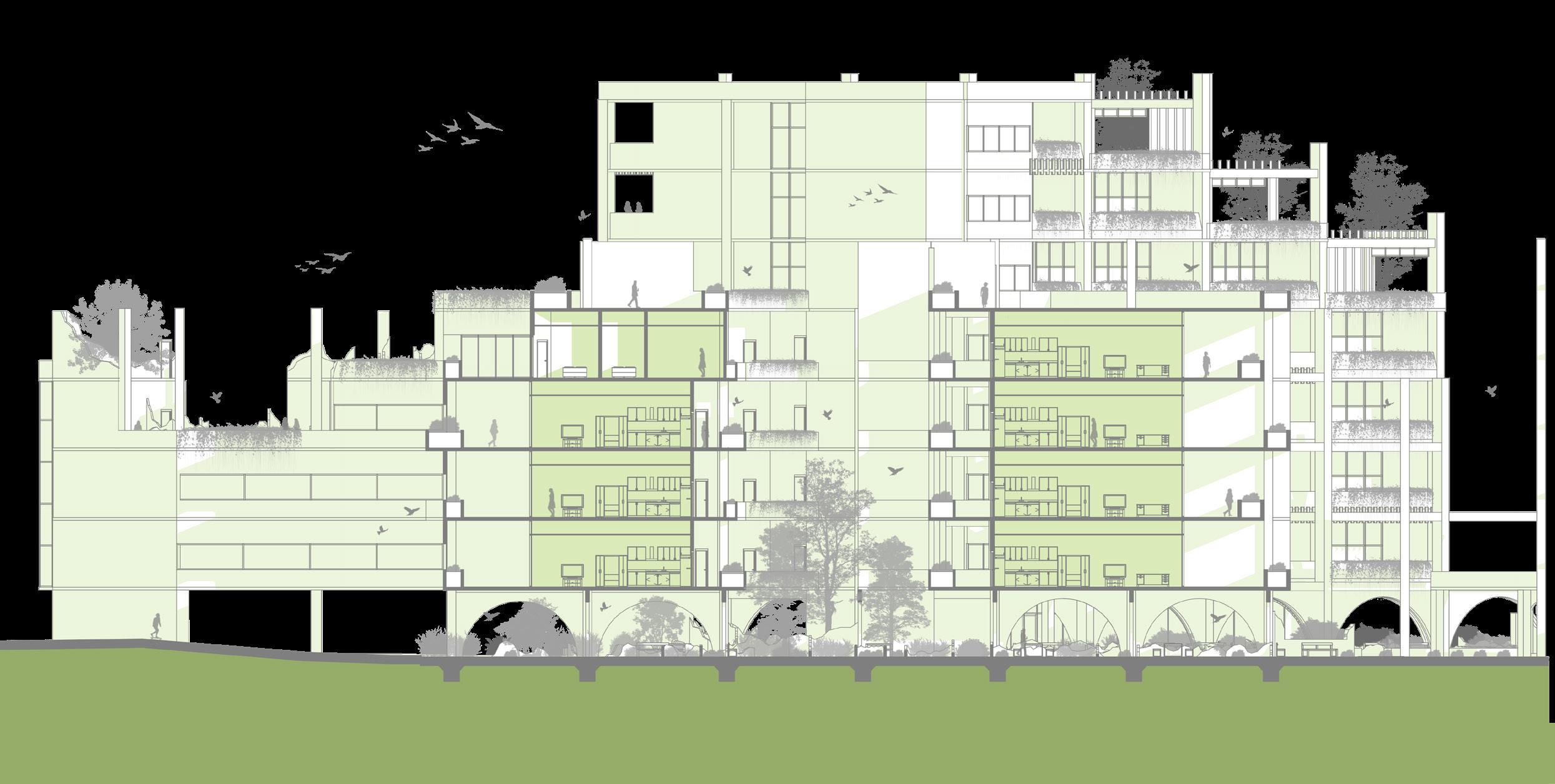 At this stage, larger trees can be introduced to the site to further enhance its biodiversity. Additionally, the reinforced structures originally used for rainwater collection can be repurposed to develop a residential area. This not only makes better use of the existing reinforced structures but also brings people closer to nature. At the same time, it allows residents to experience the surreal feeling of living within the ruins.