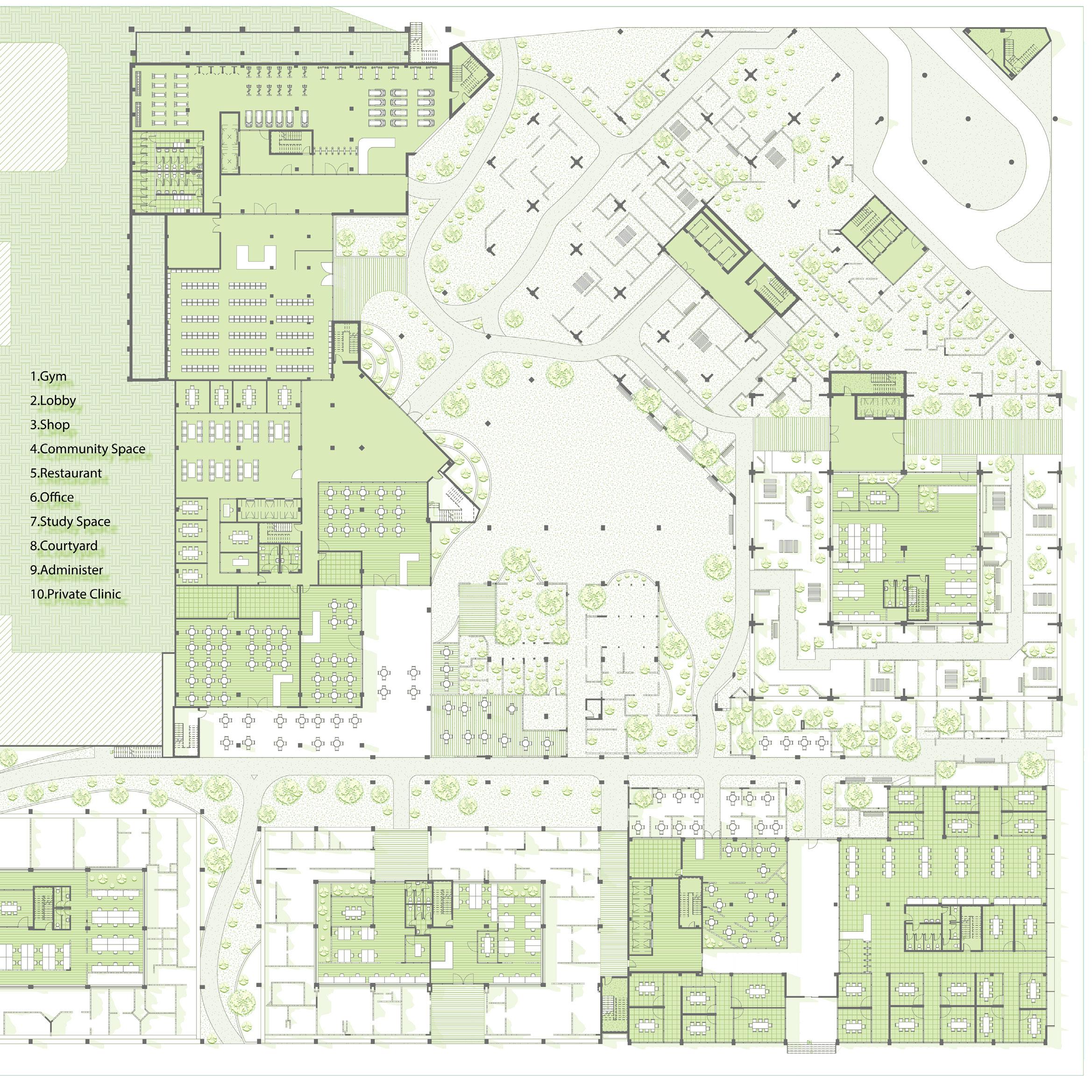 This project features continuously changing spaces that connect different floors. These changes make the space more engaging and create diverse areas to meet various needs. The height differences also provide private zones for users seeking more privacy. Additionally, this design improves the use of parking areas, transforming them into functional and pleasant spaces. Dynamic Spaces: Promoting Social Interaction and Greenery