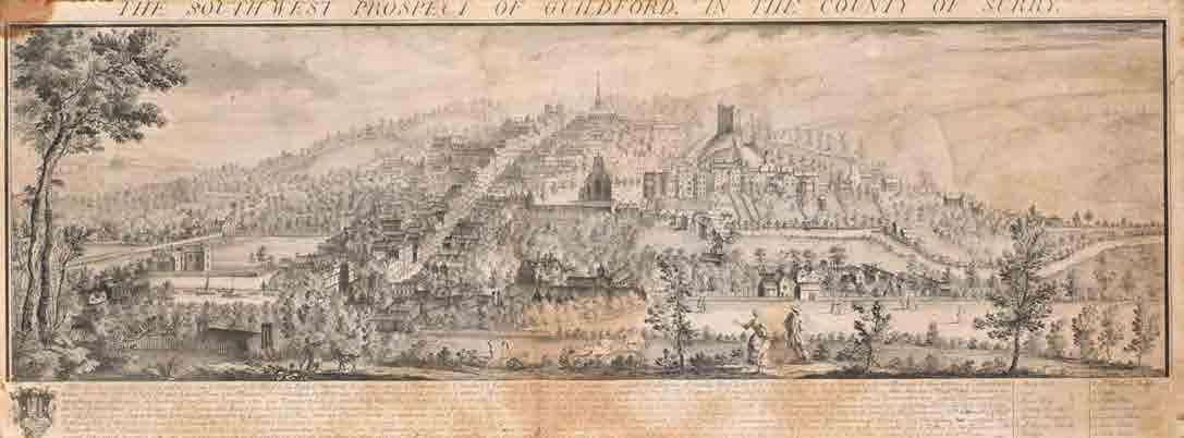 “The South West Prospect of Guildford in the County of Surry” (Surrey) Engraving