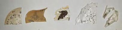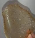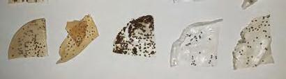 Starch-based materials are almost decomposed. Agar- and alginate-based are shrinken and fragile. Gelatin is still thick but less strong.