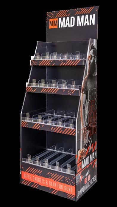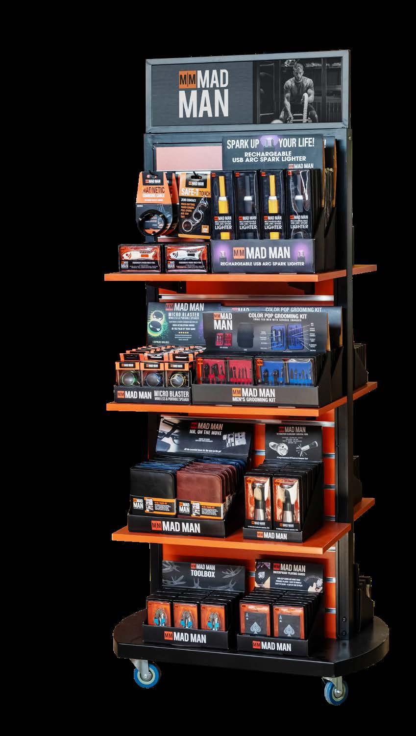 Introducing the new cardboard retail floor display that can be ready in a flash! It’s an efficient and affordable option to display a variety of your best-selling Mad Man products in any part of your store. Plus, you’ll love the Gravity Fed Shelving System, which is designed to always keep products forward-facing, clean, and neat!