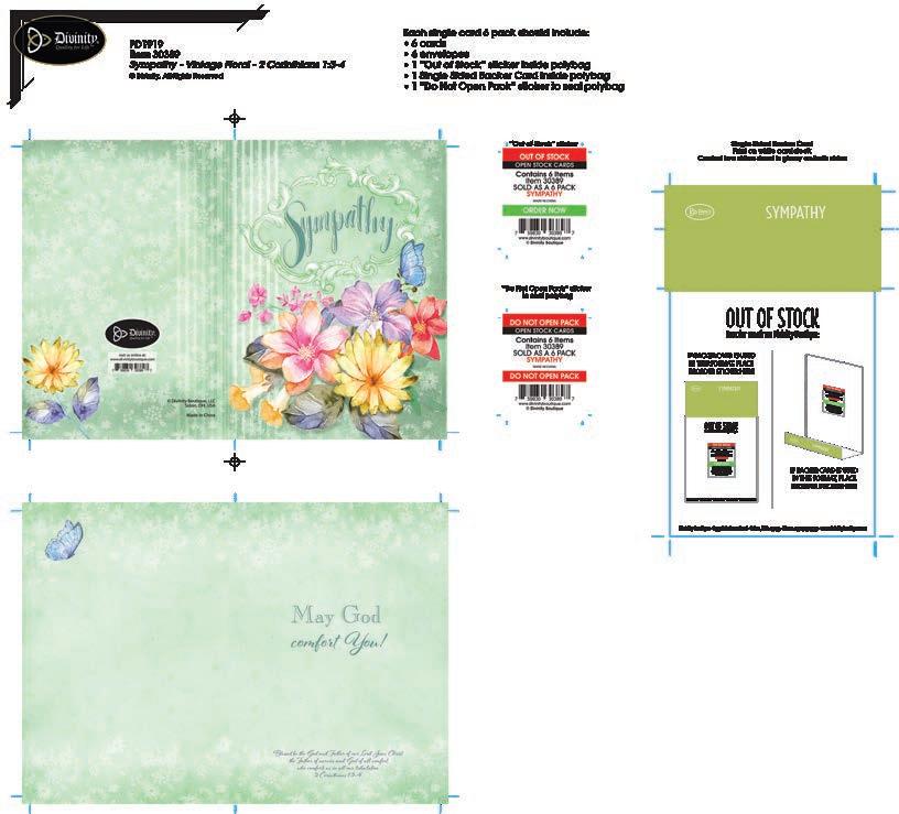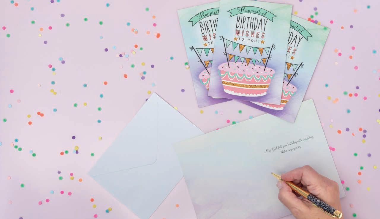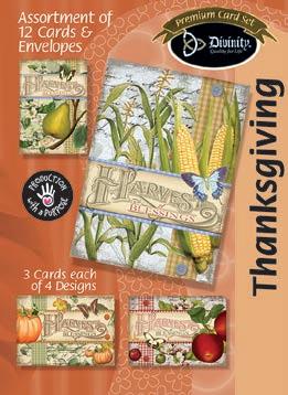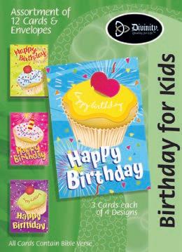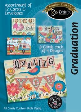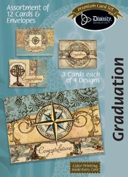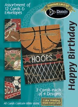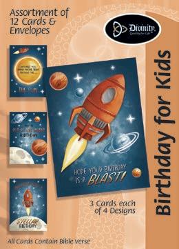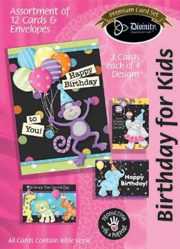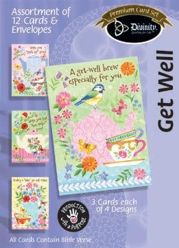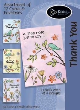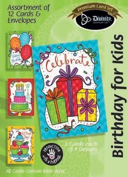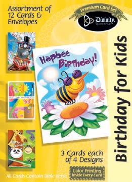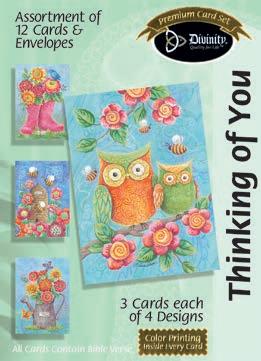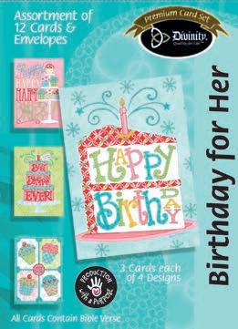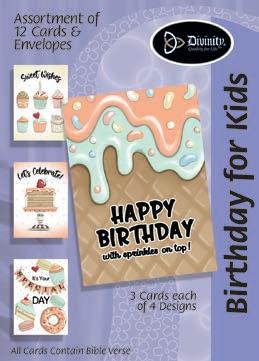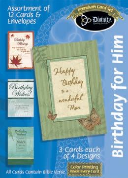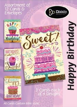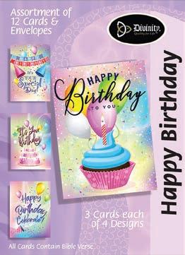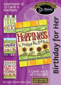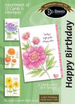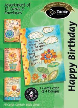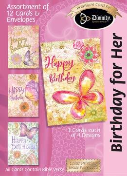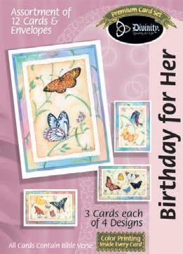4 count of each: Birthday for Her-Balloons, Cake, Cupcake and Floral; Birthday for Her-Whimsical Illustration; Birthday for Him-The Outdoors; Birthday for Him-Confetti; Encouragement-Painterly Scenery; Get WellSunshine and Flowers; Sympathy-Peach Flowers; Thank You-Blue and Teal Floral; Birthday for Kids-Sweet Treats; Birthday for Kids-Outer Space; Sympathy; Get Well-Flowers & Rainbows; Praying for You; Praying for You-Florals & Butterflies; Thank You-Merry Mushroom; Graduation