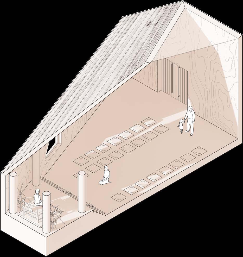 This space is designed for a scent workshop where vistors can explore and experience the methods of creating candles, incense, etc. Across this space is a gallery displaying information and history on the subject.