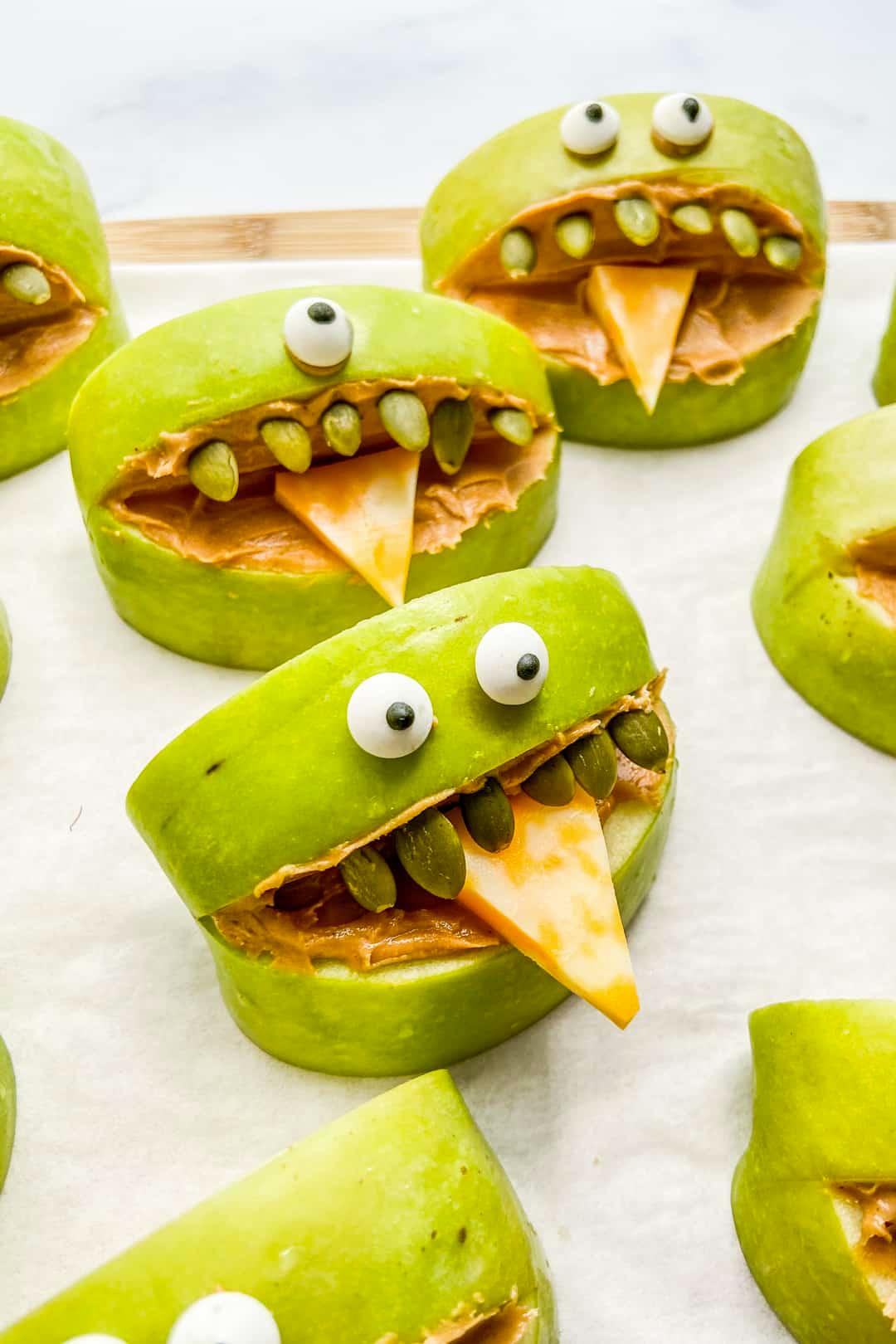 a triangular piece of cheese into each monster mouth. Using the remaining peanut butter, spread a small amount onto the back of the candy eyes and place them on top the the apple slices.