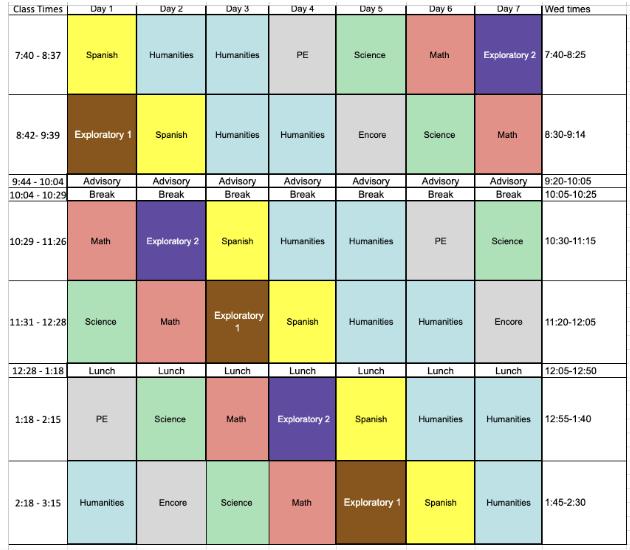 El horario de Middle School tiene una rotación de 7 días para que las clases se realicen a una hora diferente cada día. El de abajo es un ejemplo de horario y el horario de cada estudiante es único. La jornada escolar es de 7:40 am a 3:15 pm los lunes, martes, jueves y viernes. Los miércoles la jornada escolar es de 7:40 am a 2:30 pm.