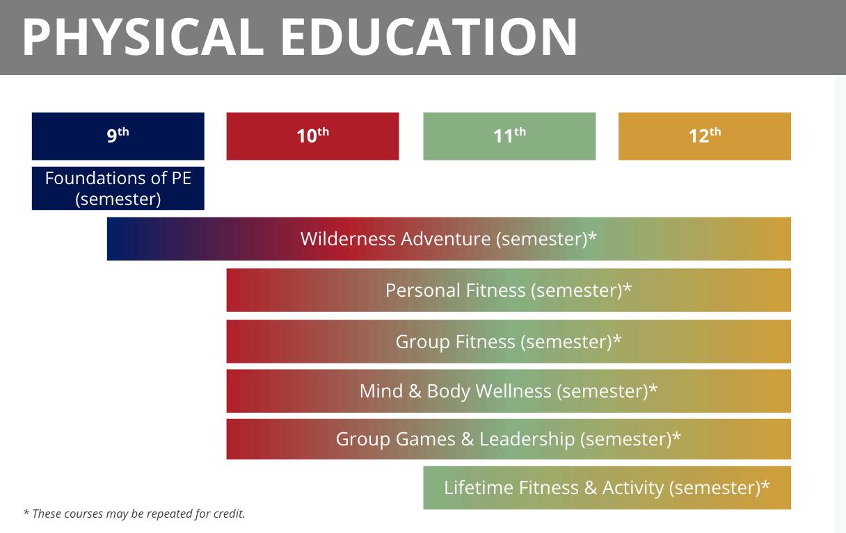 Course Code Credit Grade Foundations of Theater 6147 5 9-12 Improv* 6104 5 10-12 Stagecraft 6153 5 10-12 Theater Lab* 6149 5 10-12 Physical Education Course Code Credit Grade Foundations of PE 7040 5 9 Wilderness Adventure* 7041 5 9-12 Personal Fitness* 7004 5 10-12 Group Fitness* 7044 5 10-12 Mind & Body Wellness* 7045 5 10-12 Group Games & Leadership* 7049 5 10-12 Lifetime Fitness & Activity* 7048 5 11-12 Core/University Program Junior Core 996 N/A 11 Senior Core 997 N/A 12 Internship 995 N/A 12