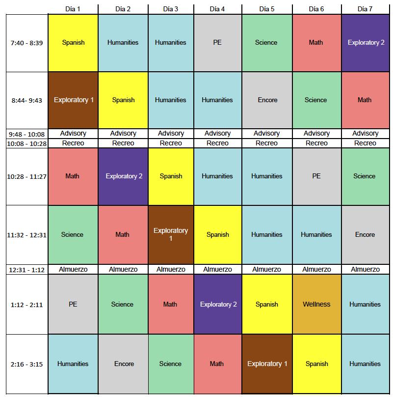 El horario de Middle School tiene una rotación de 7 días para que las clases se realicen a una hora diferente cada día. El de abajo es un ejemplo de horario y el horario de cada estudiante es único. La jornada escolar es de 7:40 am a 3:15 pm los lunes, martes, jueves y viernes. Los miércoles la jornada escolar es de 7:40 am a 2:30 pm.
