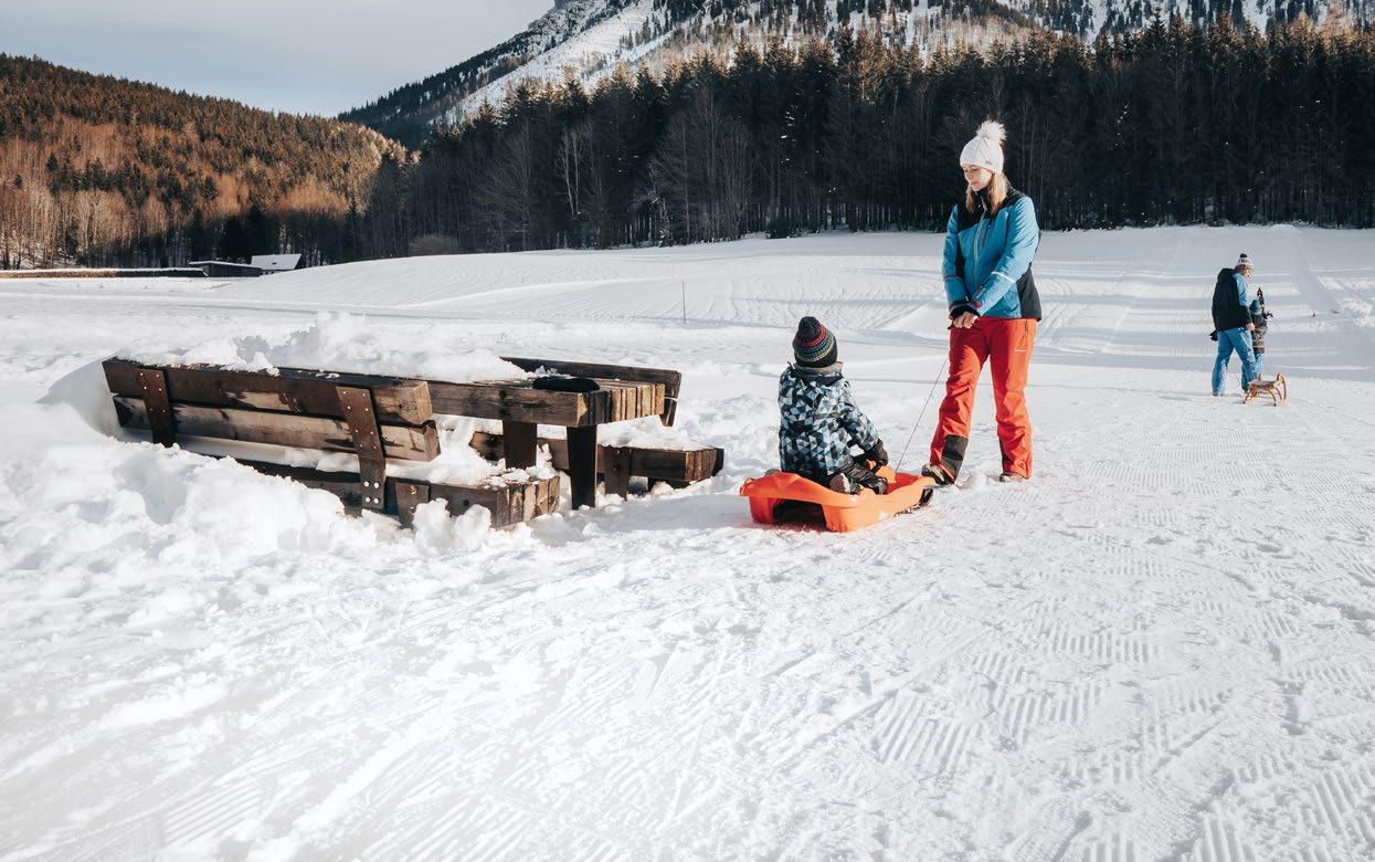 Wer lieber auf Kufen unterwegs ist, findet in Mariazell perfekte Voraussetzungen: Die 2,5 km lange Rodelbahn auf der Bürgeralpe eignet sich perfekt für rasante Abfahrten mit der Familie oder mit Freund:innen, bevor es gemütlich mit dem Bürgeralpe Express wieder retour an den Start geht. Einen Rodelverleih gibt es an der Seilbahn-Talstation. In Annaberg ist neben der Rodelwiese mit Förderband der Annaberger Lifte speziell der Tirolerkogel sehr beliebt – hier erfolgt der Aufstieg (1,5 h) allerdings zu Fuß.