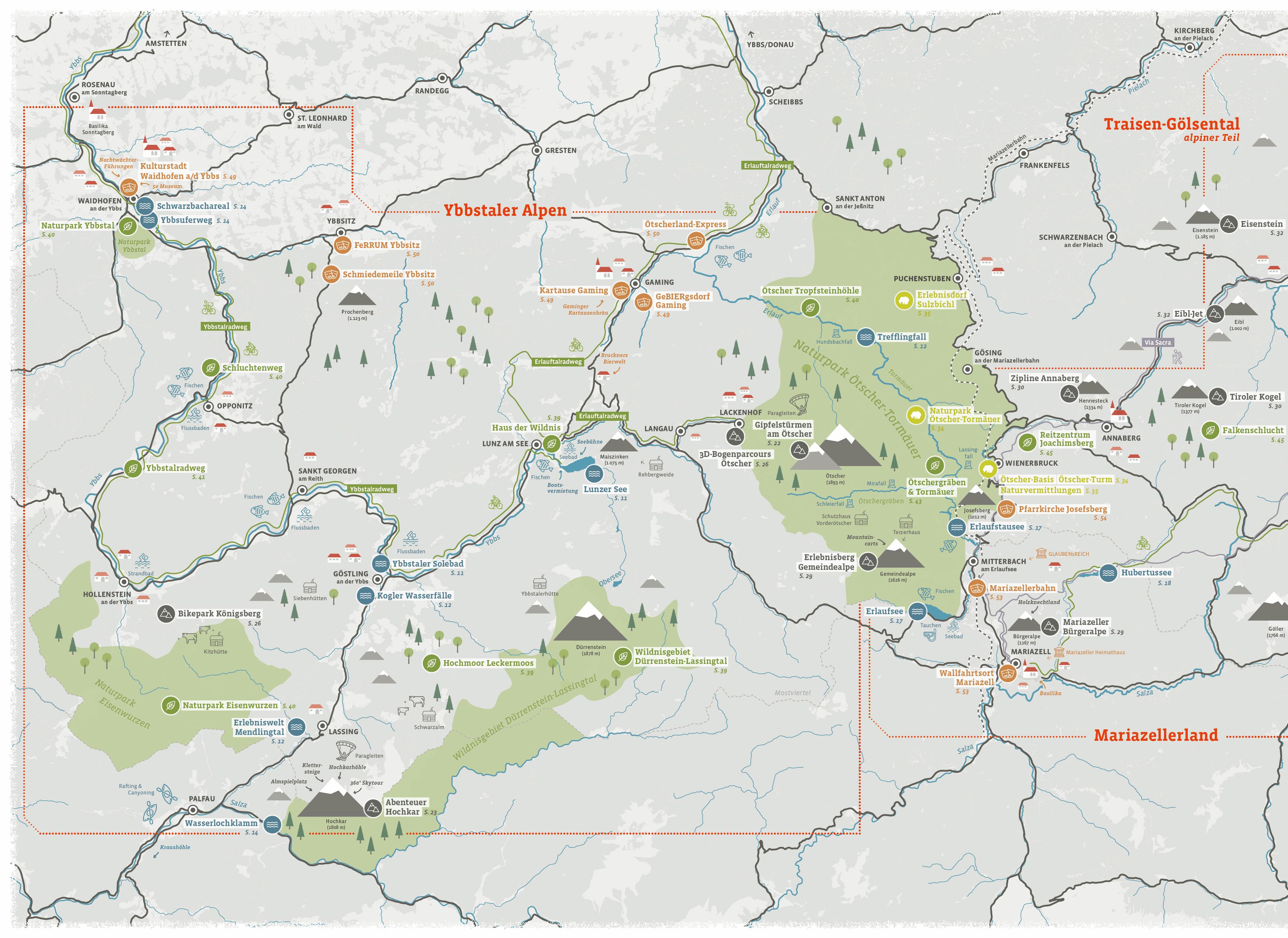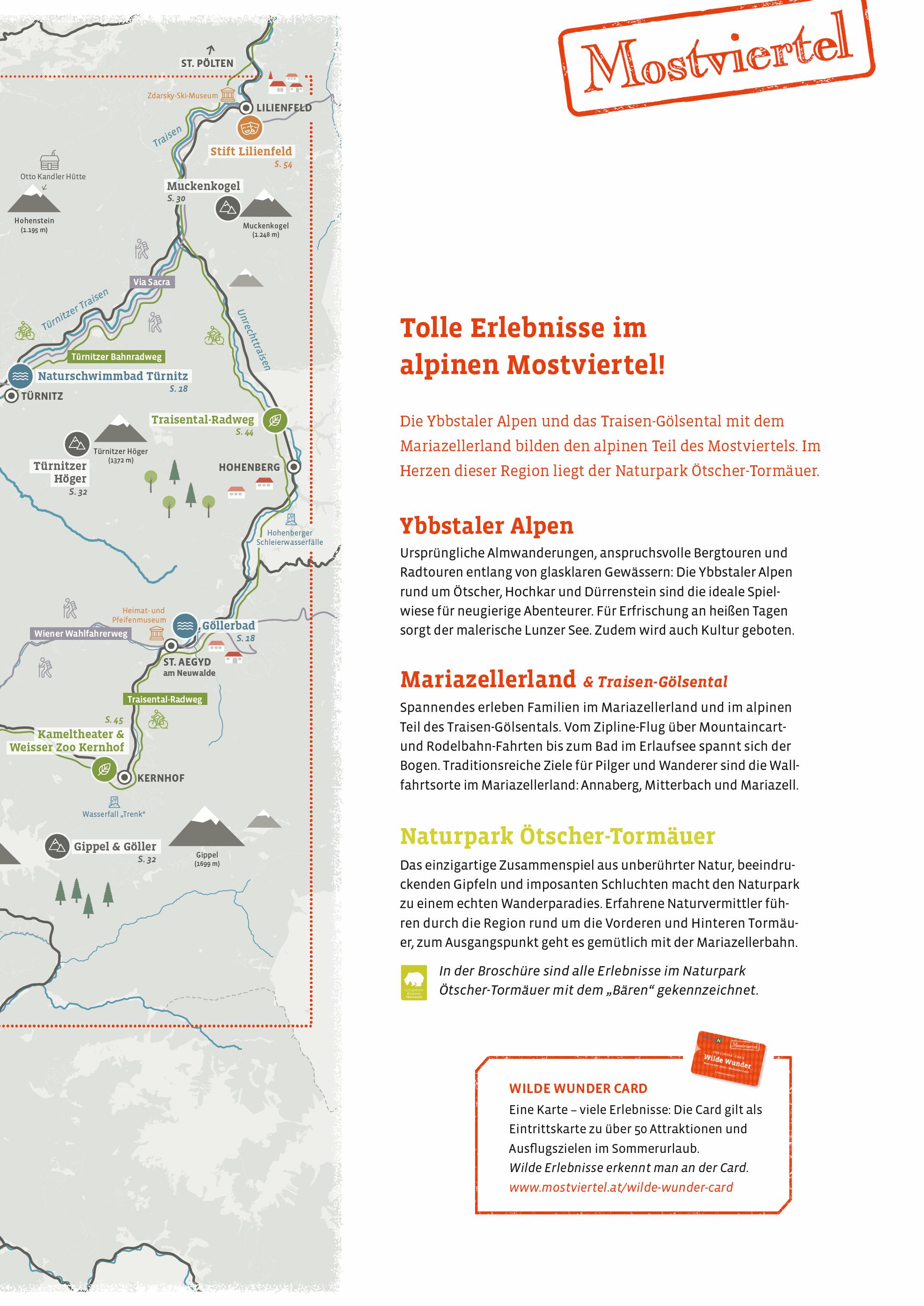 Immer wieder staunen Tagesgäste und Urlauber, wie alpin und gebirgig sich die Region rund um Ötscher, Hochkar, Dürrenstein und Gemeindealpe präsentiert Aufregende Bergabenteuer und unvergessliche Almwanderungen rund um die knapp 2 000 m hohen Gipfel sind aber noch längst nicht alles, was man hier erleben kann: Auch Radsportler, Pilger und Naturliebhaber fühlen sich wohl Dafür sorgen nicht zuletzt die erfrischenden Bergseen in Lunz und Mitterbach sowie die von malerischen Wasserfällen und imposanten Schluchten geprägte Landschaft im Naturpark Ötscher-Tormäuer Darüber hinaus garantieren die traditionellen Gipfelklaenge, das zeitgenössische Musikfestival der wellenklaenge in Lunz am See und die kulturellen Veranstaltungen in Waidhofen a/d Ybbs Kulturgenuss an besonderen Schauplätzen