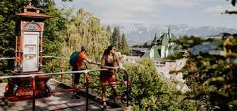 Gleich bei der Bergstation lädt der Waldseilgarten zu Abenteuern in luftiger Höhe. Auf sechs unterschiedlich schwierigen Parcours können Kinder ab sechs Jahren und Erwachsene gut gesichert balancieren und klettern. Originell: die Jausenplattform in sechs Metern Höhe.