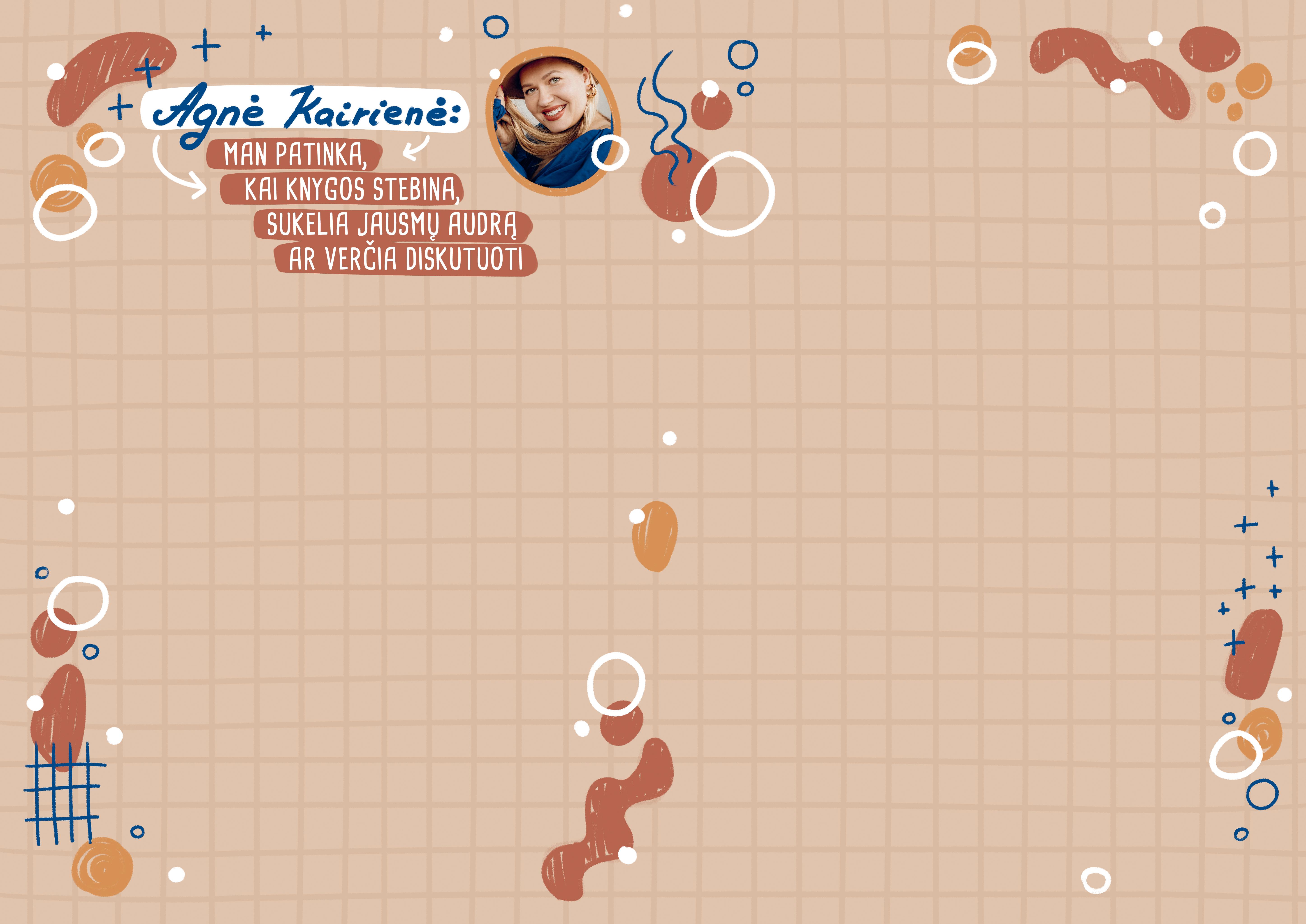 ir vidinę būseną. O ta nuotaika kasdien kinta. Drauge su ja ir knygos. Buvo metas, kai keletą mėnesių skaičiau tik detektyvinius kūrinius, vėliau visus metus negalėjau į juos nė pažiūrėti. Vos pradėjus skaityti aplankydavo jausmas, kad žinau, kuo viskas baigsis. Nemėgstu skaitydama nuobodžiauti. Man patinka, kai knygos stebina, sukelia jausmų audrą ar kviečia diskutuoti su draugais, artimaisiais, o gal net ir su pačia savimi. Ir visai nesvarbu, ar jos skirtos suaugusiesiems, ar vaikams. Dėl to lengviau atsakyti į klausimą, į kokias knygas nesinori žiūrėti. Man mažai jausmų kelia saviugdos, savęs tobulinimo knygos. Galbūt joms dar nesubrendau, galbūt dar ne laikas pasinerti į tokią literatūrą, tačiau bent jau kol kas galiu drąsiai sakyti, kad jas rečiausiai imu į rankas.