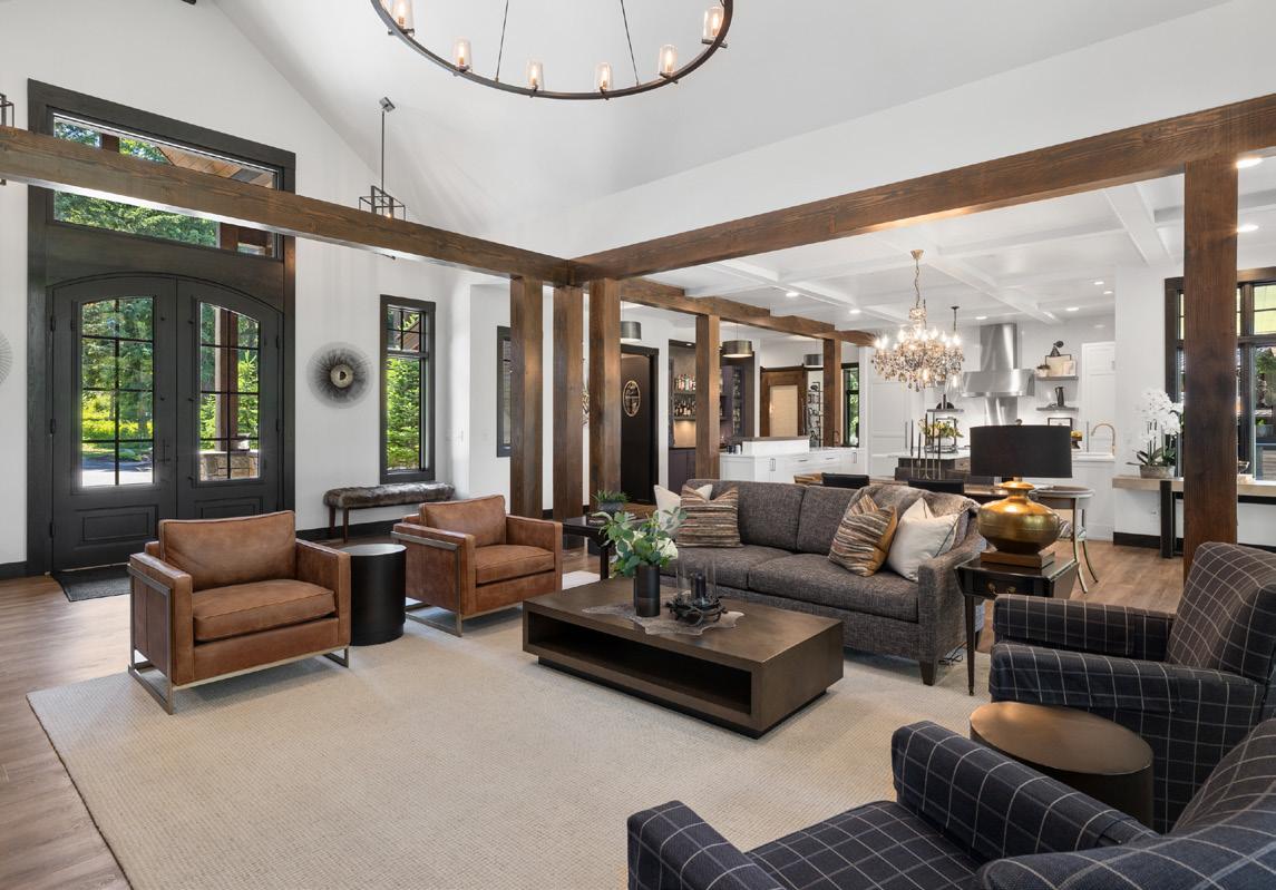 • Soaring ceilings, designer chandelier & exposed wood beams