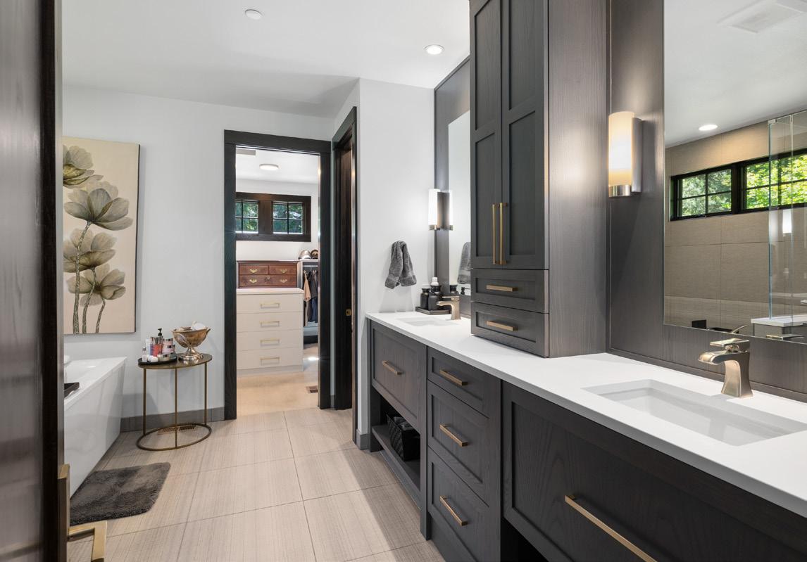 • Dual vanities with custom height quartz counters and ample storage