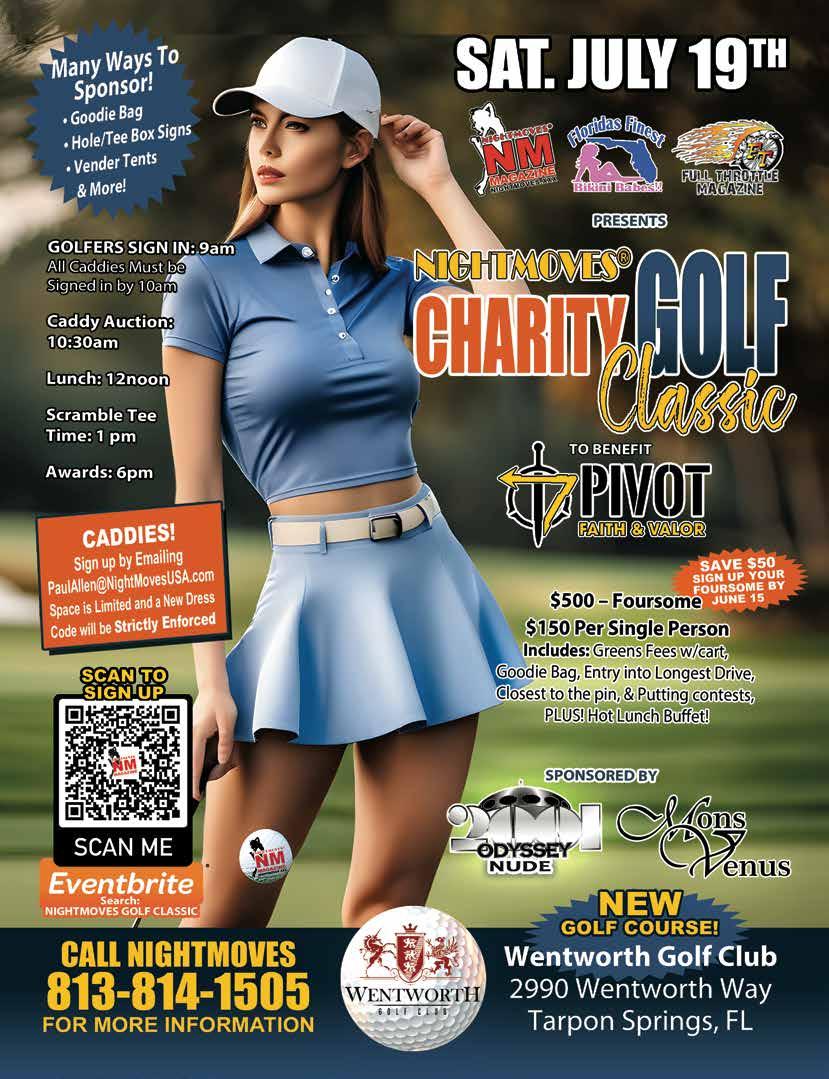 We have BIG NEWS !!! It took a while but we will be hosting our Annual NightMoves Golf Classic on Saturday July 19th. This year we will be at Wentworth Golf Course in Tarpon Springs. This is a super-nice course and we have some great raffle prizes already hooked up! If you are a potential caddy, a 4-some or a sponsor … check out the ad inside this issue or call us at 814-814-1505 (office) or 727-919-1721 (Paul Cell). We are limited to 100 golfers (25 teams) so don’t wait till the last minute!