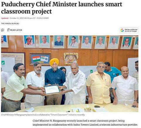 Chief Minister N. Rangasamy recently launched a smart classroom project, being implemented in collaboration with Indus Towers Limited, a telecom infrastructure provider. To boost digital literacy for over 3,000 beneficiaries