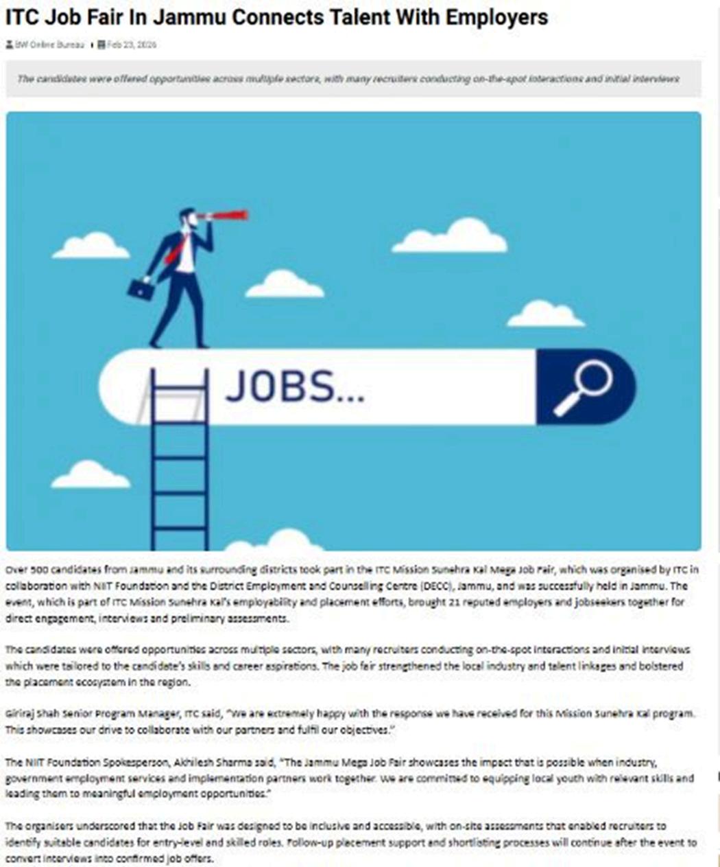 Over 500 candidates from Jammu and nearby districts participated in the ITC Mission SunehraKal Mega Job Fair, organised by ITC in collaboration with NIIT Foundation and the District Employment and Counselling Centre (DECC), Jammu. The event brought together 21 reputed employers and jobseekers for direct interactions, interviews,andpreliminaryassessments.