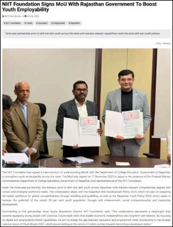 NIIT Foundation has signed a three-year MoU with the Department of College Education, Government of Rajasthan, to skill one lakh youth across the state with industry-relevantcapabilities,strengthening youth employability under the stateâs skill andyouthpolicies.