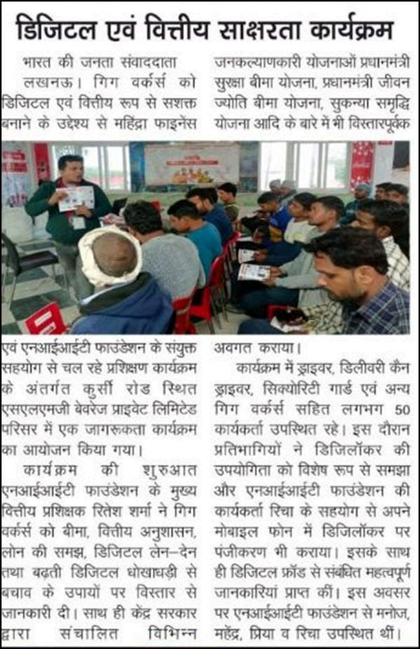 A Digital and Financial Literacy program was conducted at SLMG Beverages Pvt. Ltd., Lucknow,byMahindraFinance and NIIT Foundation to empower gig workers. The session covered digital transactions, government schemes, DigiLocker usage, and protection from digital fraud.