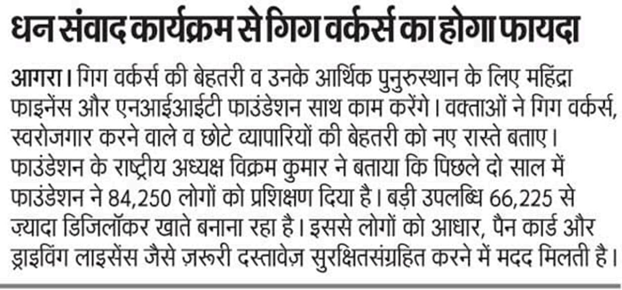 NIITFoundation,inpartnershipwithMahindraFinance, successfully conducted the Dhan Samvaad Digital & Financial Literacy Programme in Mathura, aimed at strengthening digital, financial, and cyber awareness amongworkersfromtheunorganisedsector.