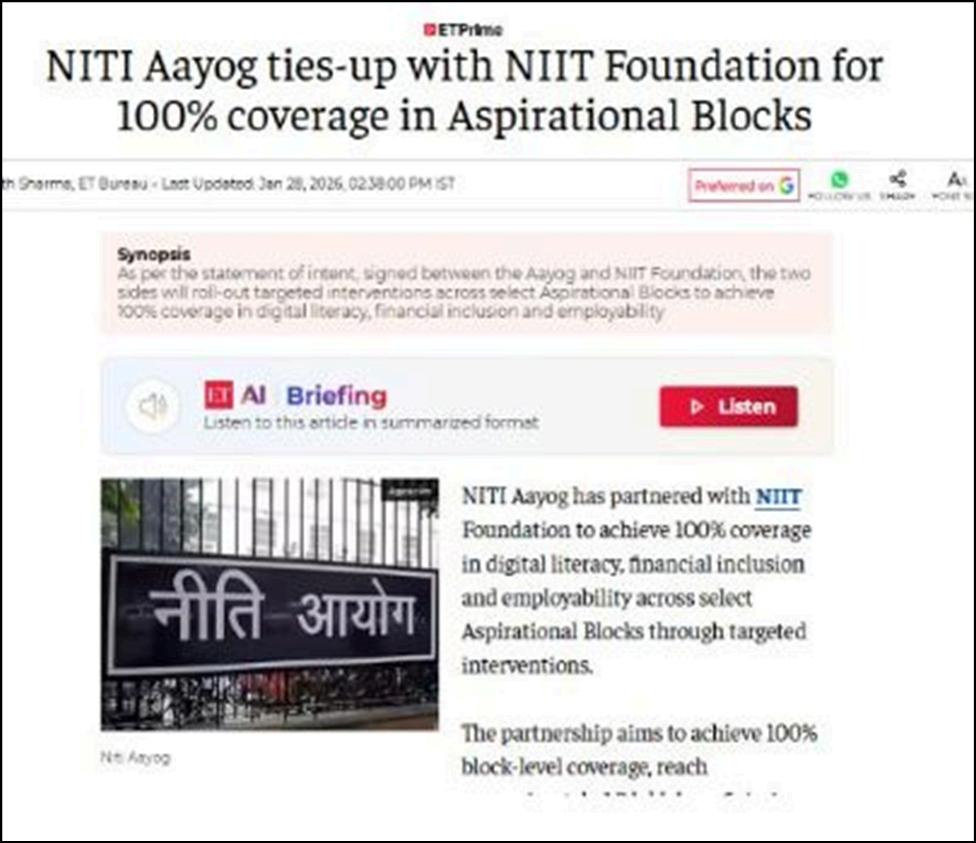 InJanuary2026,aStatement ofIntentwassignedbyBVR Subrahmanyam,CEO, NITIAayog,andCharu Kapoor,NIITFoundation,to advancedigitalliteracy, financialinclusion,andskill developmentacrossIndiaâs AspirationalBlocks