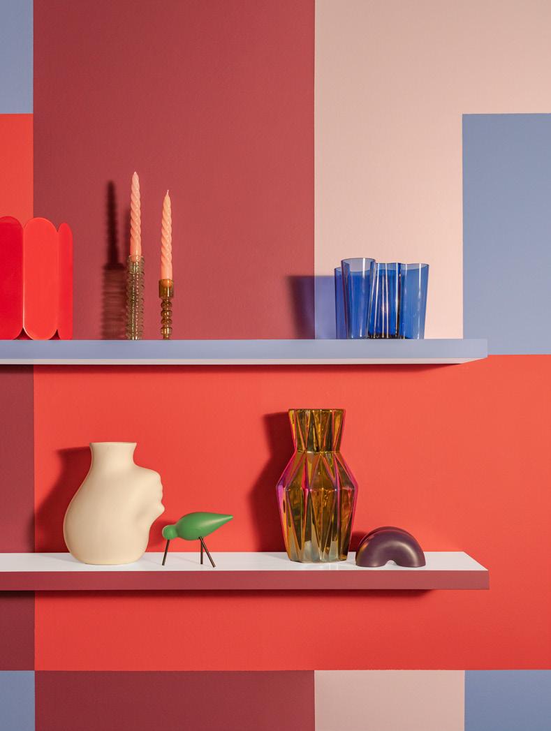 OP DE COVER vaas Arcs van HAY, 185,- kandelaar The Emeralds van HKliving, 19,95 (groot), 17,95 (klein) kaars Twist van HAY, 5,- vaas Alvar Aalto van Iittala, 139,zwevende plank van Duraline, 20,99 vaas Head Upside Down van POLSPOTTEN, 87,50 Shorebird medium van Normann Copenhagen, 35,vaas Oily van POLSPOTTEN, 77,50 deurstopper Double Donut van HAY, 55,-