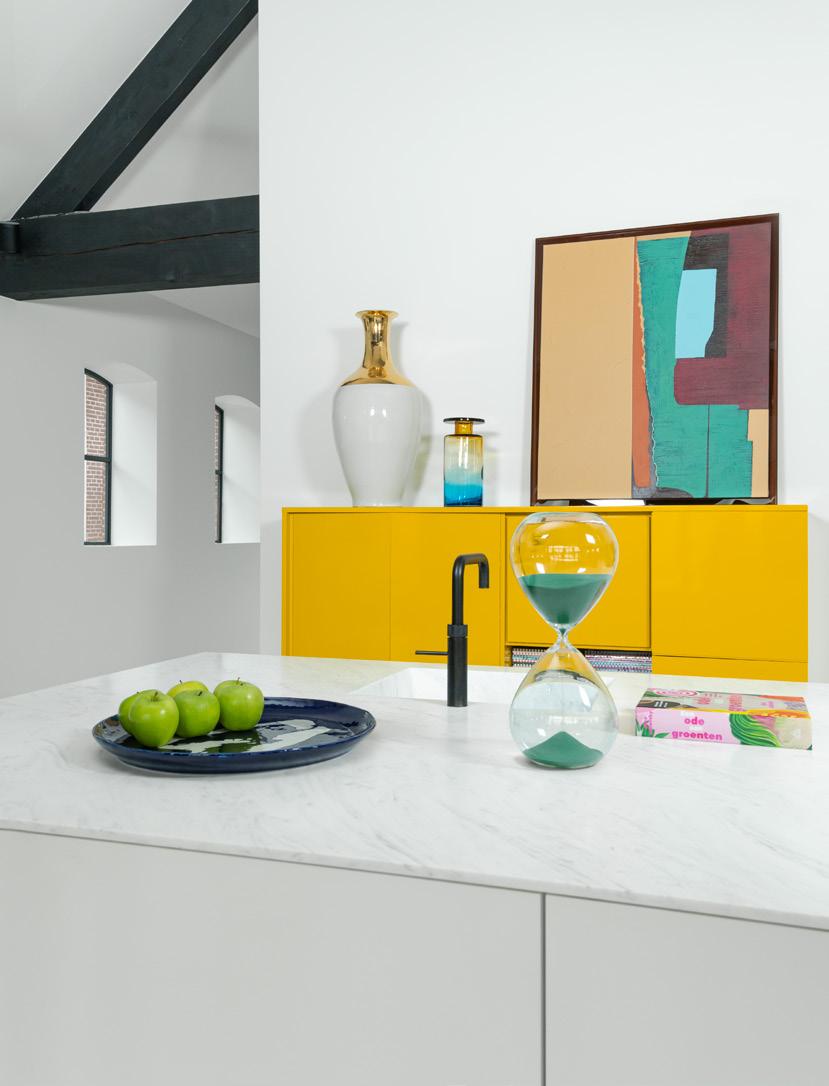 schilderij 'get your groove on' van HKliving, 695,- kruk Zig Zag van POLSPOTTEN, 325,- lampenvoet Oily van POLSPOTTEN, 209,- lampenkap Geel van POLSPOTTEN, 220,wandkast Fern Green van HKliving, 1195,- vaas Thin Neck van POLSPOTTEN, 165,- bloempot Lips, 49,-