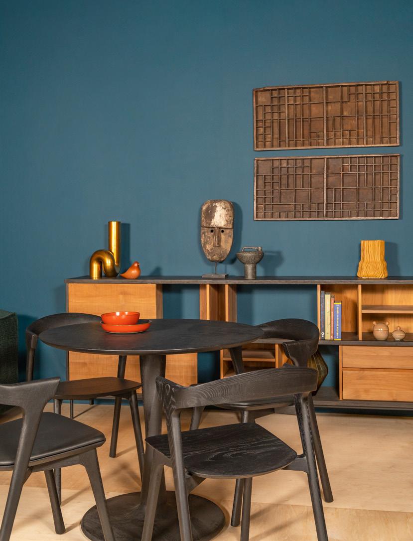 vaas Yourtube van POLSPOTTEN, 105,- houten letterbak, 27,50 masker op voet, 95,- vaas Magny van Broste Copenhagen, 55,eetkamerstoel Bok van Ethnicraft, 589,- eetkamertafel Torsion van Ethnicraft, 1159,-